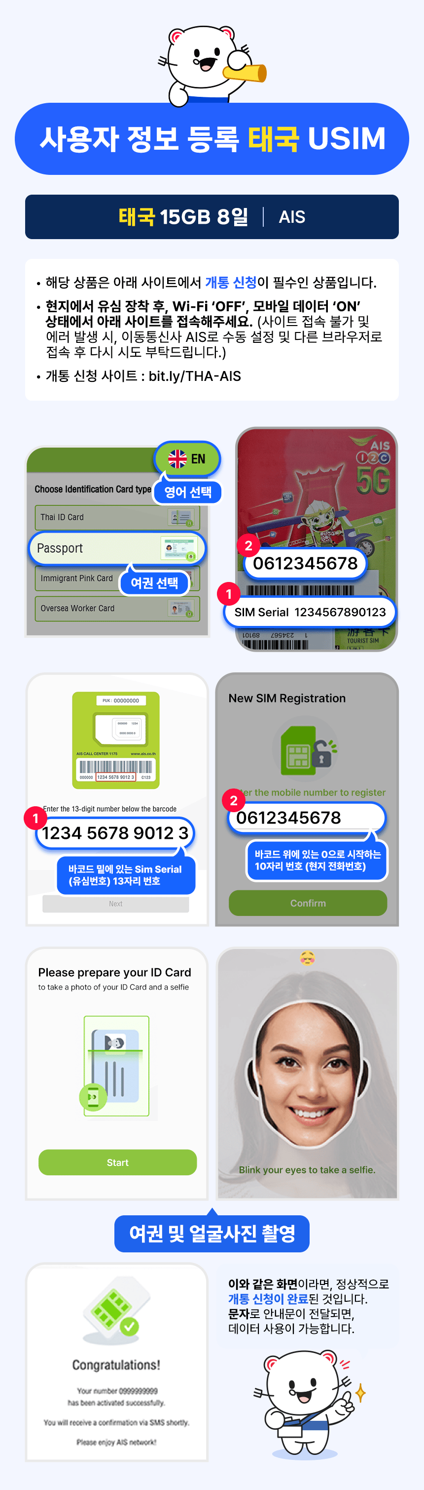 ▶ 이용방법 - ✅ 유심 교체 방법 1. 휴대폰에서 심트레이 위치 확인 2. 유심핀으로 구멍을 눌러 심트레이 분리 3. 유심카드를 트레이에 맞게 장착 4. 트레이를 다시 휴대폰에 삽입 5. 휴대폰 재부팅 → 통신망 자동 연결 6. 데이터 로밍 팝업이 뜨면 ‘확인’ 선택 7. 화면 우측 상단 안테나 옆에 통신사명 표시 여부 확인 - ✅ 데이터 로밍 설정 아이폰: 설정 → 셀룰러 → 셀룰러 데이터 ON → 셀룰러 데이터 옵션 → 데이터 로밍 ON 안드로이드: 설정 → 연결 → 데이터 사용 & 해외 로밍 → 모바일 데이터 및 데이터 로밍 ON 데이터 이용을 위해 반드시 휴대폰의 데이터 로밍 기능이 활성화되어야 합니다.