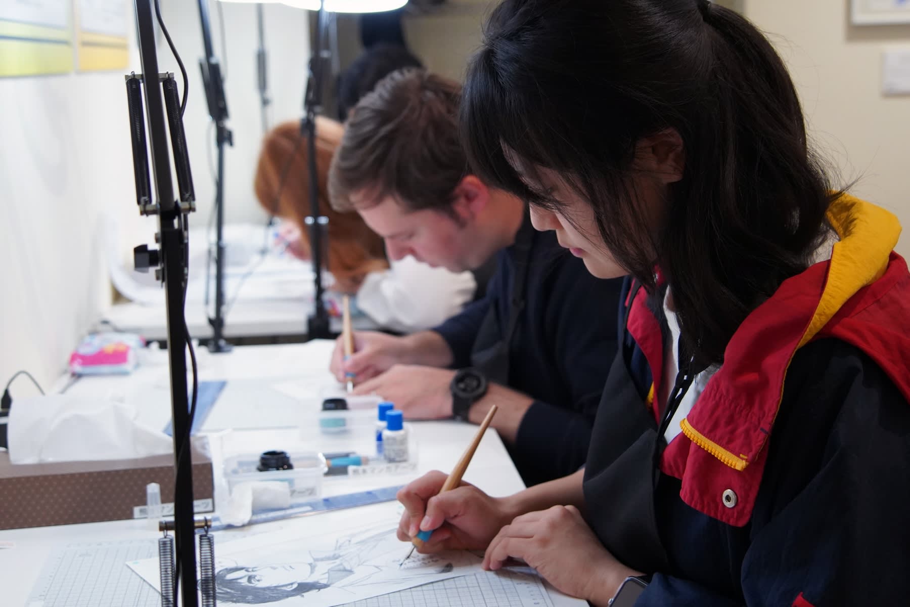 처음이신 분, 그림에 자신이 없으신 분도 안심 G펜 사용법은 스태프가 정성껏 지도하므로 그림에 자신이 없는 분이나 처음 G펜을 잡는 분도 안심하고 참가해 주세요.