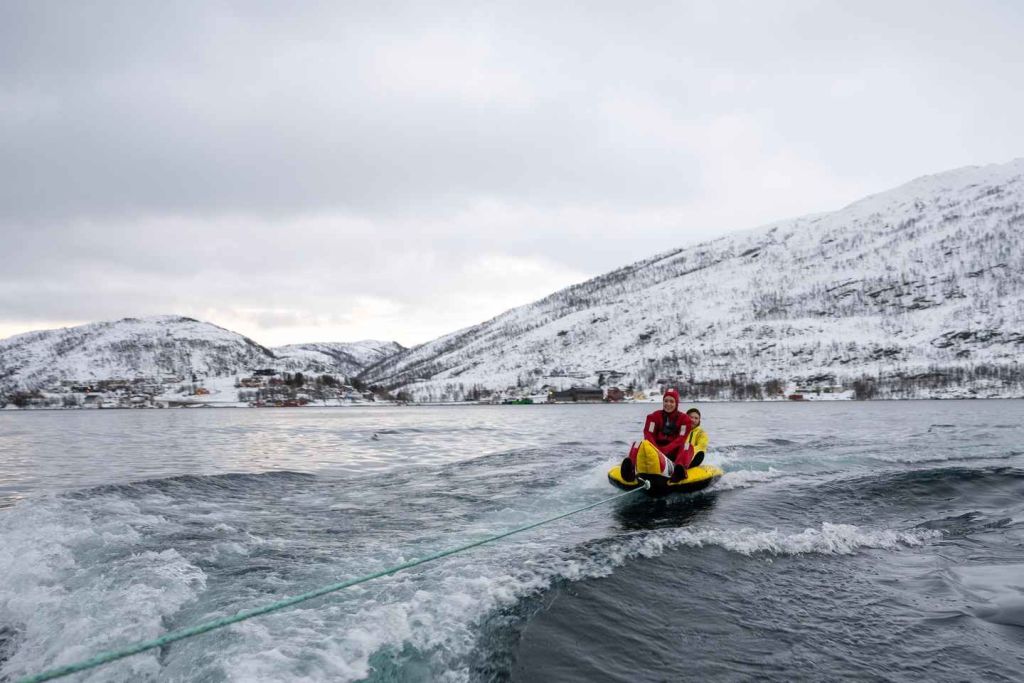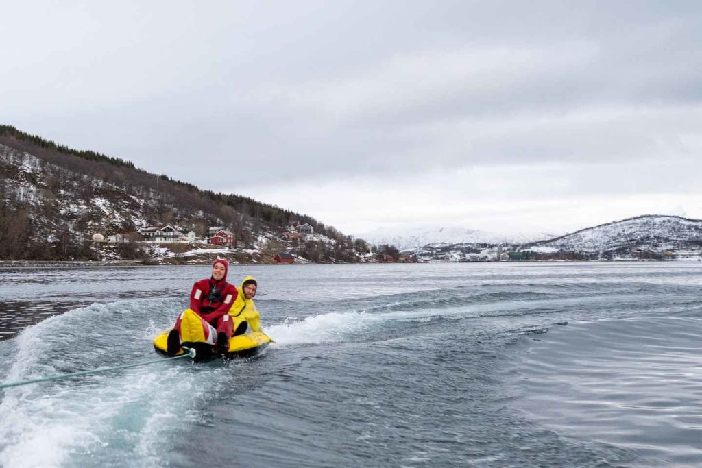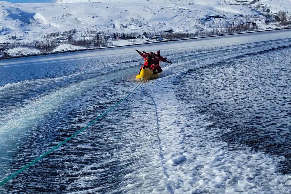 복장을 갖추고 나면 바나나 튜브가 기다리는 해안으로 이동합니다. 보트가 가속할 때 차가운 북극의 공기와 얼음 물의 튀는 느낌을 느끼며, 안정적이고 화려한 바나나 튜브에 안전하게 앉아 있습니다. 눈 덮인 산맥과 순수한 북극의 풍경이 펼쳐지는 파노라마 뷰를 즐기며 열린 바다를 미끄러지듯 이동합니다.
