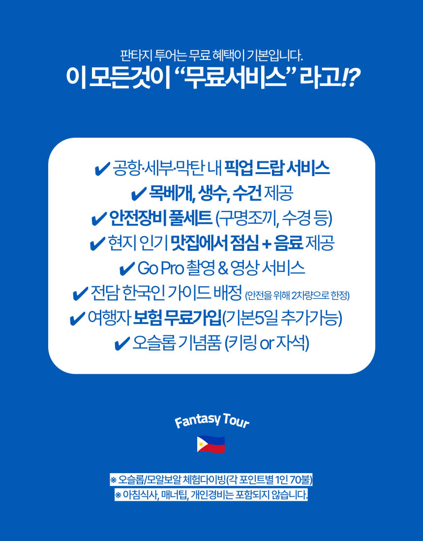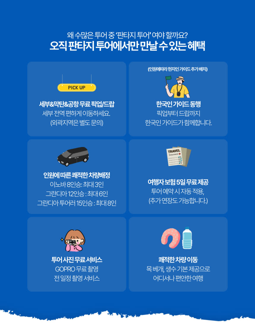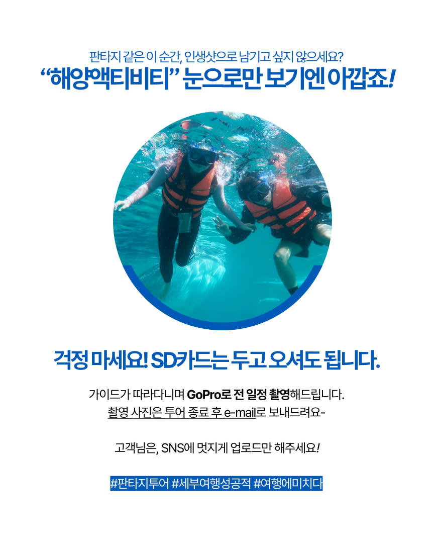친구처럼 편안한 현지 가이드가 함께하며, 낯설지 않고 따뜻한 여행을 즐기실 수 있어요. 고래상어와의 짜릿한 만남, 투말록폭포에서의 청량한 힐링, 모알보알 바다거북과의 특별한 순간까지… 하루가 소중한 추억으로 물들어갑니다.
