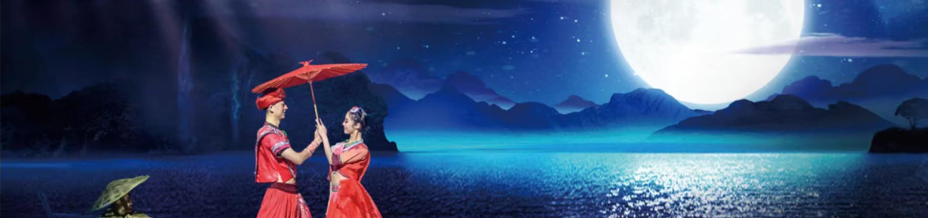 "육지, 바다, 하늘이 어우러진 3차원 세계! 800마일의 리강 아래 펼쳐지는 계림의 영원한 사랑 문화 코드를 탐험하세요." + 5막으로 구성된 계림의 영원한 사랑 공연, 놀라운 데뷔작 + 문명에 영감을 불어넣는 고대의 부름, 풍습을 보여주는 땅의 노래, 감정을 전달하는 쌀국수와 불꽃놀이, 변천사를 이야기하는 정강궁, 전설을 노래하는 유삼걸, 이 모든 것이 계림의 영원한 사랑 시청각 향연에 담겨 있습니다.