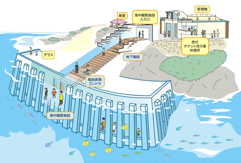 미야코지마 해저 공원에서는 편한 복장으로 산책하며 바다 속을 들여다 볼 수 있습니다.