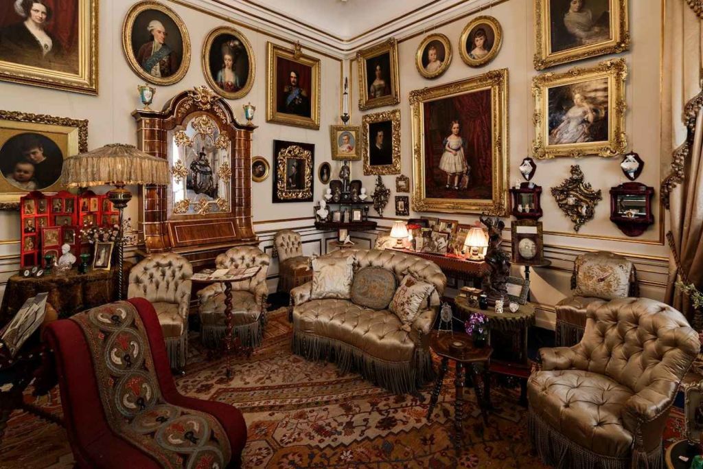 1895년경 루이즈 여왕의 개인 살롱은 당시의 현대적인 실내 장식을 반영합니다. 방의 그림과 테이블 위의 액자 사진은 유럽 전역에 걸쳐 긴밀한 관계를 맺은 그녀의 부유 한 가족 생활을 증언합니다.
