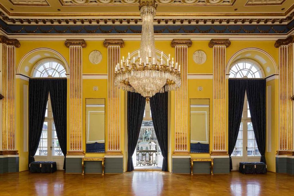 8m의 높은 천장 높이와 화려한 금장 장식, 궁전 광장의 전망을 자랑하는 갈라 홀은 덴마크에서 가장 인상적인 방 중 하나입니다. 1794년 왕실은 예술가 니콜라이 아빌드가드에게 인테리어 디자인을 의뢰했습니다. 유명한 조각가 베르텔 토르발센이 조각품을 제작했습니다.