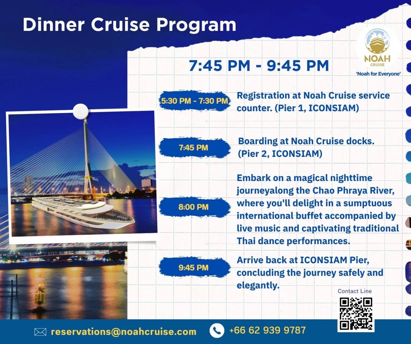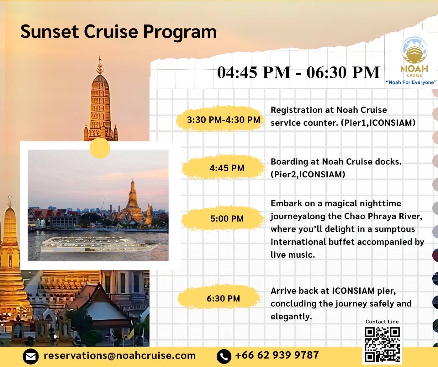 ▶아이콘시암 선셋 크루즈 (운항 시간: 16:45-18:30) * 노아 크루즈 아이콘시암 1번 부두 노아 크루즈 체크인 지점 * 노아 크루즈 아이콘시암 1층 스타벅스 근처 무료 시암 기프트카드 교환처 ▶[월요일 - 목요일] 아이콘시암 선착장 디너 크루즈 (운항 시간: 19:45-21:45) * 노아 크루즈 아이콘시암 1번 부두 노아 크루즈 체크인 지점 * 노아 크루즈 아이콘시암 1층 스타벅스 근처 무료 시암 기프트카드 교환처 ▶[금요일 - 일요일] 아이콘시암 선착장 디너 크루즈 (운항 시간: 19:45-21:45) * 노아 크루즈 아이콘시암 1번 부두 노아 크루즈 체크인 지점 * 노아 크루즈 아이콘시암 1층 스타벅스 근처 무료 시암 기프트카드 교환처 ▶[발렌타인 데이] 아이콘시암 선착장 디너 크루즈 (운항 시간: 19:45-21:45) * 노아 크루즈 아이콘시암 1번 부두 노아 크루즈 체크인 지점 * 노아 크루즈 아이콘시암 1층 스타벅스 근처 무료 시암 기프트카드 교환처