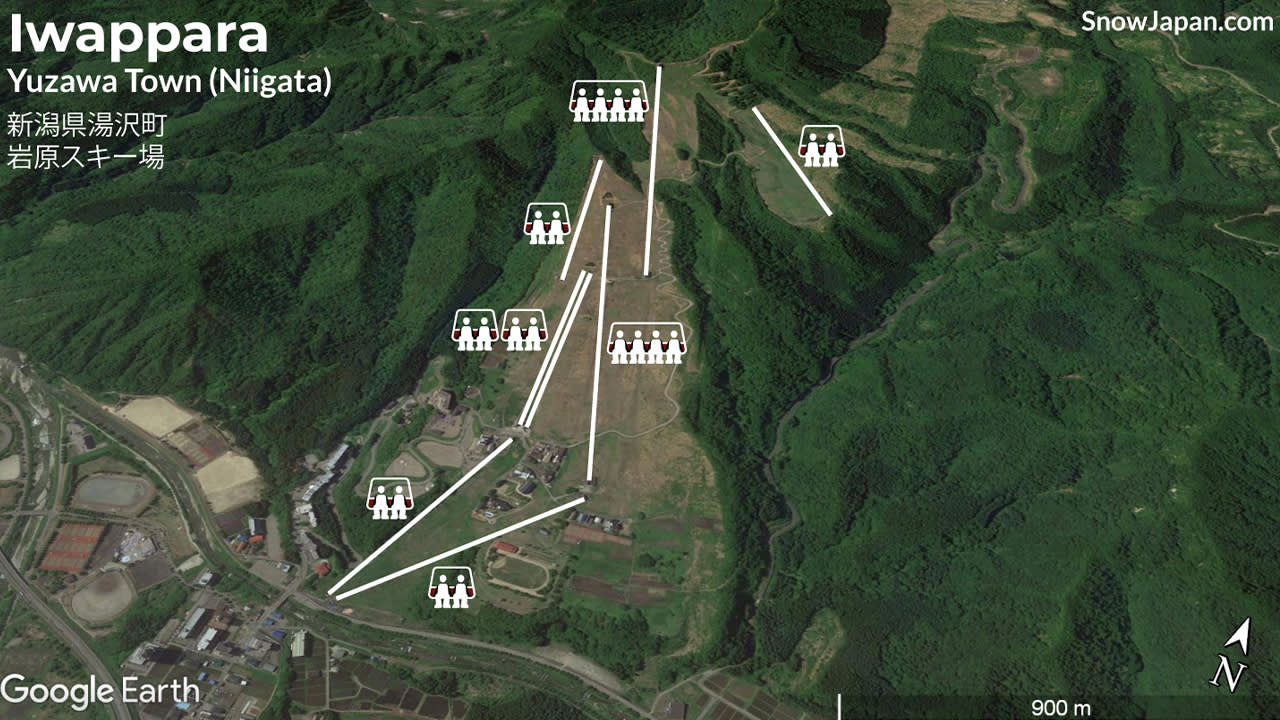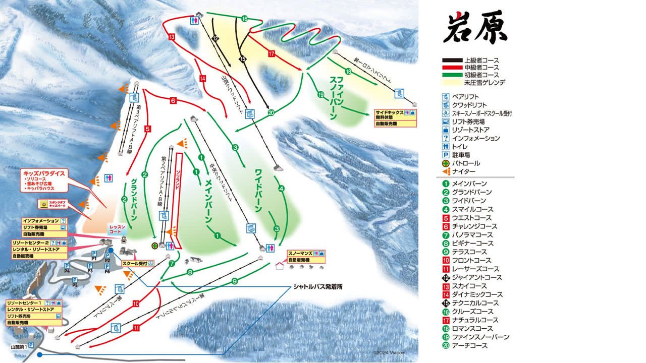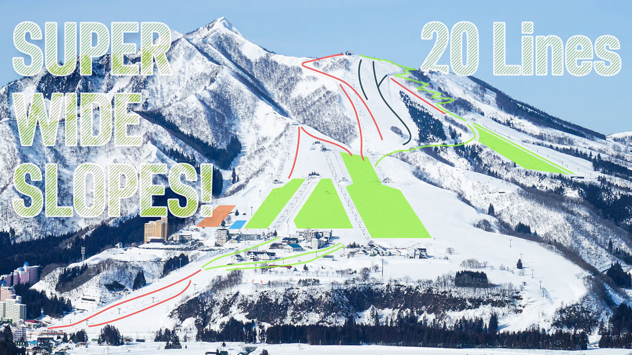 이와파라 스키 리조트(Iwappara Ski Resort)는 간토 지역에서 매우 인기 있는 스키장 중 하나이며, 1931년 개장 이후 초보자와 가족들에게 사랑받고 있습니다. 스키장에는 2개의 고급(검은색 선), 7개의 중급(빨간색 선) 및 여러 개의 초급(녹색 선) 슬로프를 포함하여 20개의 다양한 레벨의 슬로프가 있으며, 그 중 40% 이상이 초보자 코스입니다. 가장 큰 특징은 폭 600m의 초대형 초급 슬로프로, 초보자는 안심하고 S자 턴(S Turn)을 연습할 수 있으며, 고급 플레이어는 carving 기술을 마음껏 체험할 수 있습니다.