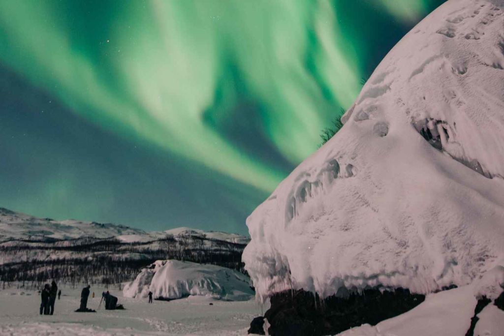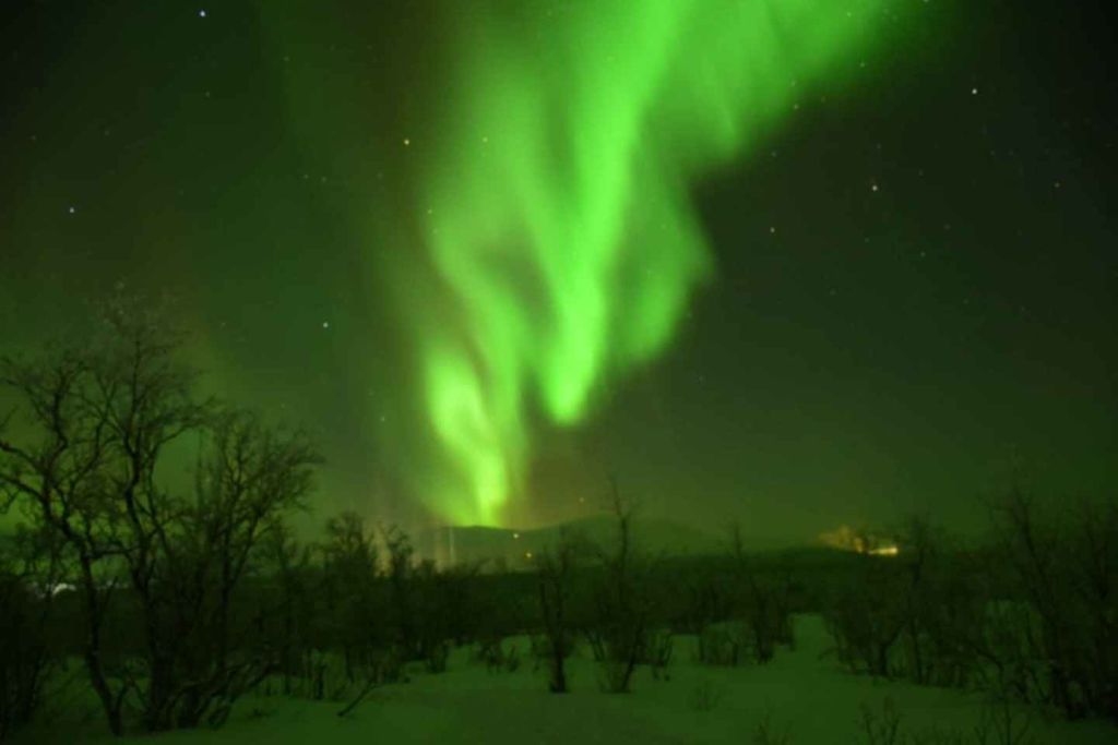 길을 따라가며 잠시 멈추어 황야의 고요함을 느끼고, 맑은 북극의 공기를 마시며, 머리 위의 드넓은 하늘을 올려다보세요. 맑은 밤에는 오로라의 첫 징후를 볼 수 있습니다. 가이드가 이 지역과 전통, 그리고 오로라의 마법에 대한 이야기를 들려드리며 오로라가 춤추는 모습을 볼 수 있도록 도와드립니다. 운이 좋다면, 오로라가 나무 위를 소용돌이치며 하늘을 채우는 것을 볼 수 있을 것입니다.