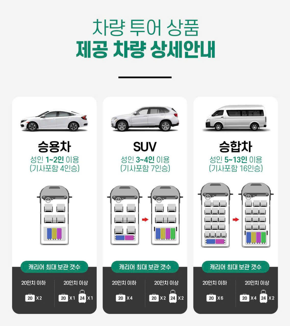 * 예약인원별 차량제공안내, 성인 1-2인 승용차 / 3-4인은 SUV 차량 제공 / 성인 5-13인은 승합차 제공