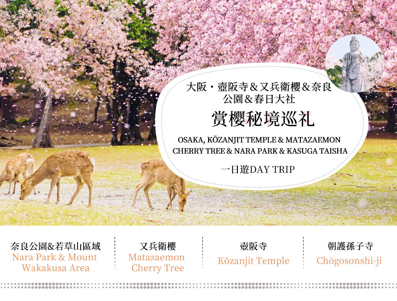 • 오사카에서 출발하여 간사이의 봄 벚꽃 명소를 편안하게 즐겨보세요. 첫 번째 목적지인 나라 공원에서 사랑스러운 사슴들과 가까이에서 교감해 보세요. 3시간의 자유시간 동안 도다이지/가스가타이샤 등 일본 문화유산을 방문할 수도 있습니다. 다음으로 향하는 곳은 고향의 숨겨진 비경인 교부사쿠라로, 사진 촬영 필수 코스입니다. 이어서 방문하는 곳은 쓰보사카데라 절의 벚꽃 대불로, 거대한 불상과 벚꽃이 함께 어우러져 웅장하면서도 몽환적인 분위기를 자아냅니다. 마지막으로 시기산 조고손시지 절로 이동하여 산림의 봄 풍경 속에서 행운을 기원해 보세요.