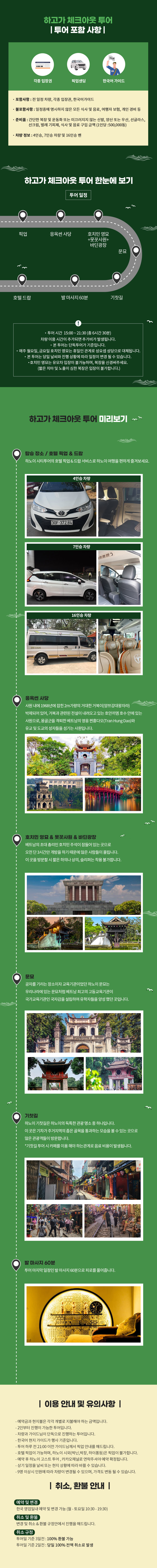 체크아웃 후, 단독 차량과 단독 한국어 가이드와 같이 다니는 체크아웃투어는하노이의 거의 모든 명소들을 하루에 둘러보고 공항으로 이동을 합니다. 하노이 내에 있는 호텔에서 미팅을 진행하며 끝난 뒤에도 센딩 서비스가 진행이 됩니다.
