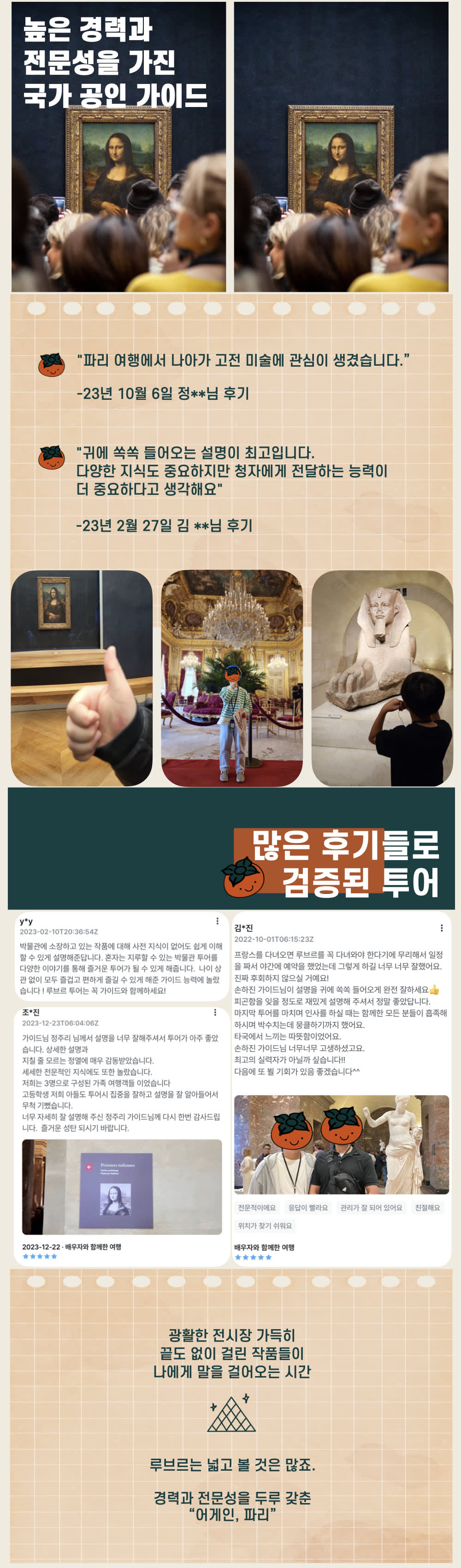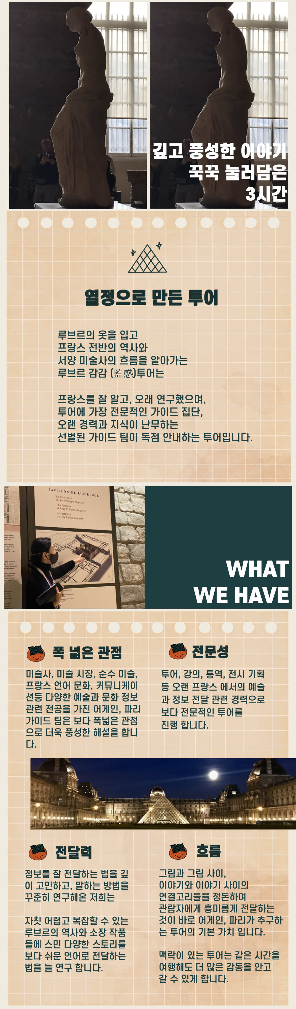 높은 경력과 전문성을 가진 국가공인가이드가 열정으로 만든 투어는 여행자들로 하여금 수 천년 역사의 루브르를 스스로 "감"監(보고)하고 "감"感(느끼게)하게 합니다.