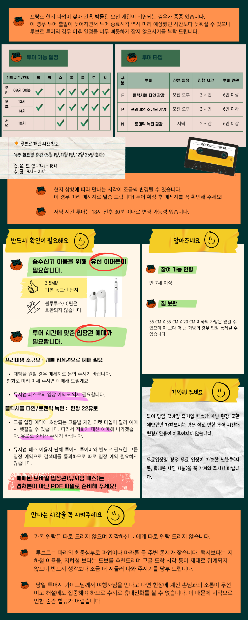 🍑상담 후 입장권 예매 부탁 드립니다. 소규모 투어가 아닌 다인 투어의 경우 박물관 규정상 일반 입장권 사용이 불가합니다. (그룹별 개인권으로 예매 필요) 🍑프랑스 도착 당일 투어 참여는 교통문제와 파업등 여러 현지 상황으로 시간에 맞추어 오기 힘들 수 있습니다. 규정에 제시된대로 이로 인한 당일 취소/환불이 불가하니 반드시 도착 당일 예약은 피하여 예약 주시기를 당부 드립니다. ♥️ 각 옵션별로 한 팀당 정원과 진행 시간이 상이하니 꼼꼼히 체크 후 예약 부탁 드립니다. ♥️ 정확한 만남 시각은 메시지로 다시 한번 안내해 드리고 있으니 꼭 🍑메세지 확인🍑 부탁드려요! 🕙 오전 9시 30분 만남 / 오후 2시 (혹은 3시) 만남 / 저녁 5시 50분 만남 (저녁 만남 시각 전후 30분 변경 가능성 있음) ☑️ 저녁시간 투어는 박물관 야간 개관일인 수요일과 금요일만 가능합니다. ☑️ 수, 금 저녁에 운영되는 투어는 3시간 소규모, 3시간 다인, 2시간 다인 등으로 신청이 가능 합니다. ☑️ 매월 첫째 주 금요일 저녁은 투어가 진행되지 않습니다. (7, 8월 제외) ♥️ 입장권 예매가 어려우시다면 대신 예매해 드릴 수 있습니다. 1인 38,500원씩 (해당월 기준 환율로 인해 변동될 수 있으며 다시 메세지로 안내 드립니다) 한화로 미리 전달 부탁 드립니다. 요청 주시면 메세지로 자세히 알려드리겠습니다. ( ※ 참고 : 루브르 박물관 1인 입장료는 박물관 공식 홈페이지 22유로, fnac 등 2차 예매 사이트 금액 평균 약 24유로 입니다.) ♥️ 6인 이상 진행되는 다인 투어의 경우 반드시 상담 후 입장권 예매를 부탁 드립니다. 박물관 규정에 따라 6인 이상의 그룹 진행 시 그룹 예약권 (70e, 업체 부담)이 필요하며 이에 호환되는 개별 입장권으로의 예약이 필요하기 때문입니다. ♥️ 6인 이상 진행되는 다인 투어의 경우 업체 이름으로 등록된 그룹 예약권(70e, 업체 부담)에 예약 시간이 이미 포함되어 있으므로 뮤지엄 패스와 무료입장의 경우 따로 입장 예약 필요가 없습니다. ♥️ 뮤지엄 패스는 금액이 많고 큐알 노출 등 여러 염려가 있어 대행이 어렵습니다. 대신 구매해 드릴 순 없지만 이미 뮤지엄 패스를 구매하신 상태에서 이를 이용한 입장 예약이 어려우실 경우 미리 말씀 주시면 수수료 없이 입장 예약해 놓을 수 있습니다. 실사용이 가능한 뮤지엄 패스 혹은 e-museumpass (PDF 파일로 준비, 캡쳐본 불가) 만 잘 가져와 주시기를 부탁드립니다. ♥️ 최소 투어 가능 인원은 총 4인 입니다. 투어 일주일 전까지 4인이 모이지 않으면 모객 부족으로 투어가 취소될 수 있음을 너르게 이해 부탁 드립니다. 모객 부족으로 인한 투어 취소는 100프로 환불 됩니다.