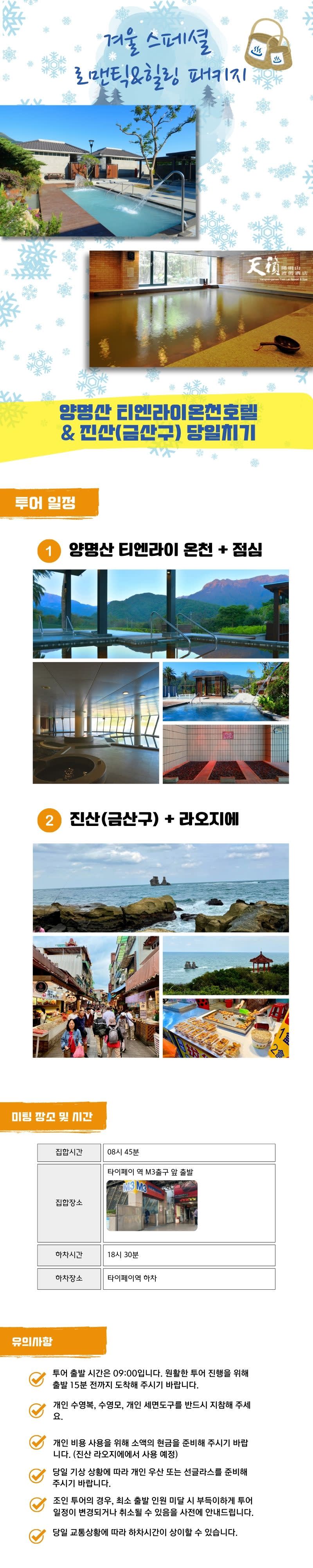 양명산 티엔라이 온천호텔에서 온천과 힐링을 즐기며 인생샷을 남기고, 진산(금산)에서 해안을 낀 장관과 명소를 탐방해보 실 수 있습니다.