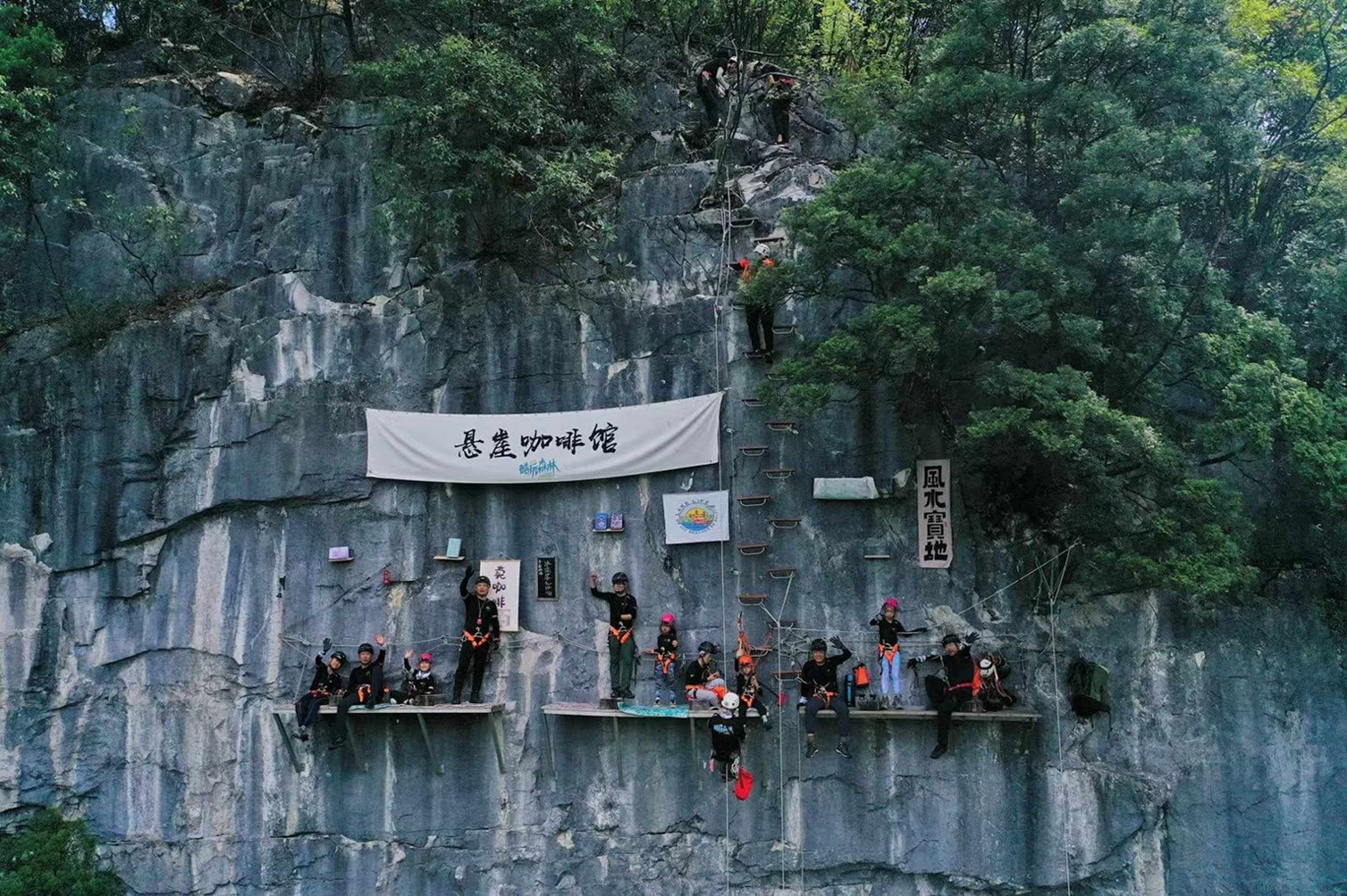 * "하늘과 땅을 넘나드는" 다채로운 경험은 쿨플레이 포레스트의 핵심 매력입니다. 고공 액티비티 중 200m 높이의 절벽 카페에 오르는 것은 필수 체험 코스입니다. 전문 장비를 착용하고 암벽 등반을 한 후, 공중에 떠 있는 플랫폼에서 봉우리와 숲이 겹겹이 펼쳐진 풍경을 감상하고, 따뜻한 커피 한 잔을 들고 산과 강을 배경으로 사진을 찍으면 순식간에 소셜 미디어를 장식할 멋진 사진을 찍을 수 있습니다. 또한 절벽 그네, 고공 슬랙라인 등의 액티비티는 아드레날린과 산야의 풍경이 짜릿한 쾌감을 선사합니다.