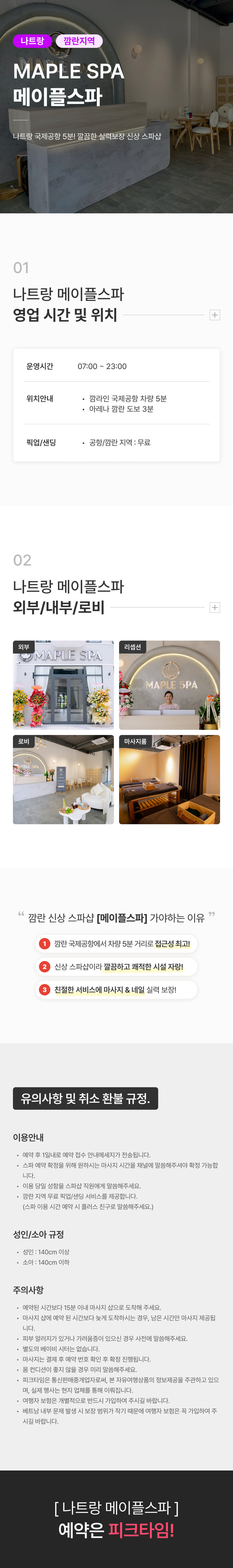 ✨메이플 스파 오픈 기념 특별 프로모션(8/13~)✨🚗 2인 이상 예약 시 나트랑·혼총·아미아나 지역까지 무료 픽업 서비스(편도) 제공** 프로모션은 현지 사정에 따라 예고 없이 중단될 수 있습니다.