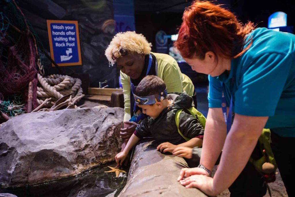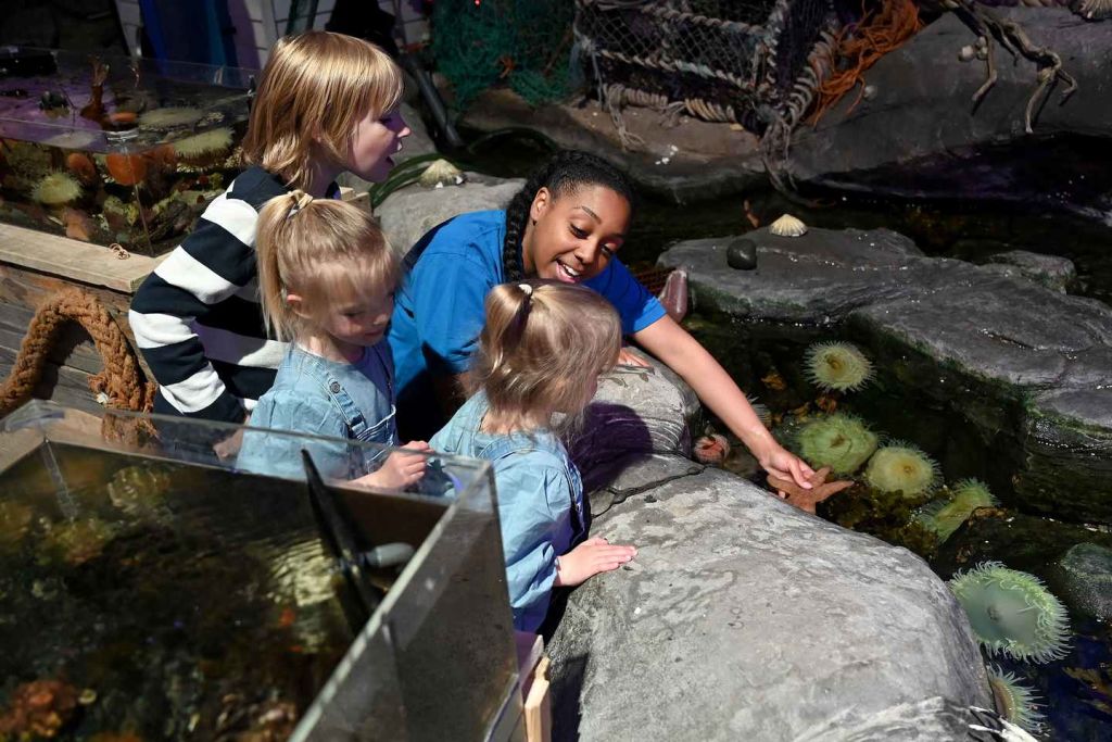 바위 웅덩이에 들어가서 바다 별, 성게, 말미잘을 실제로 느껴보세요.