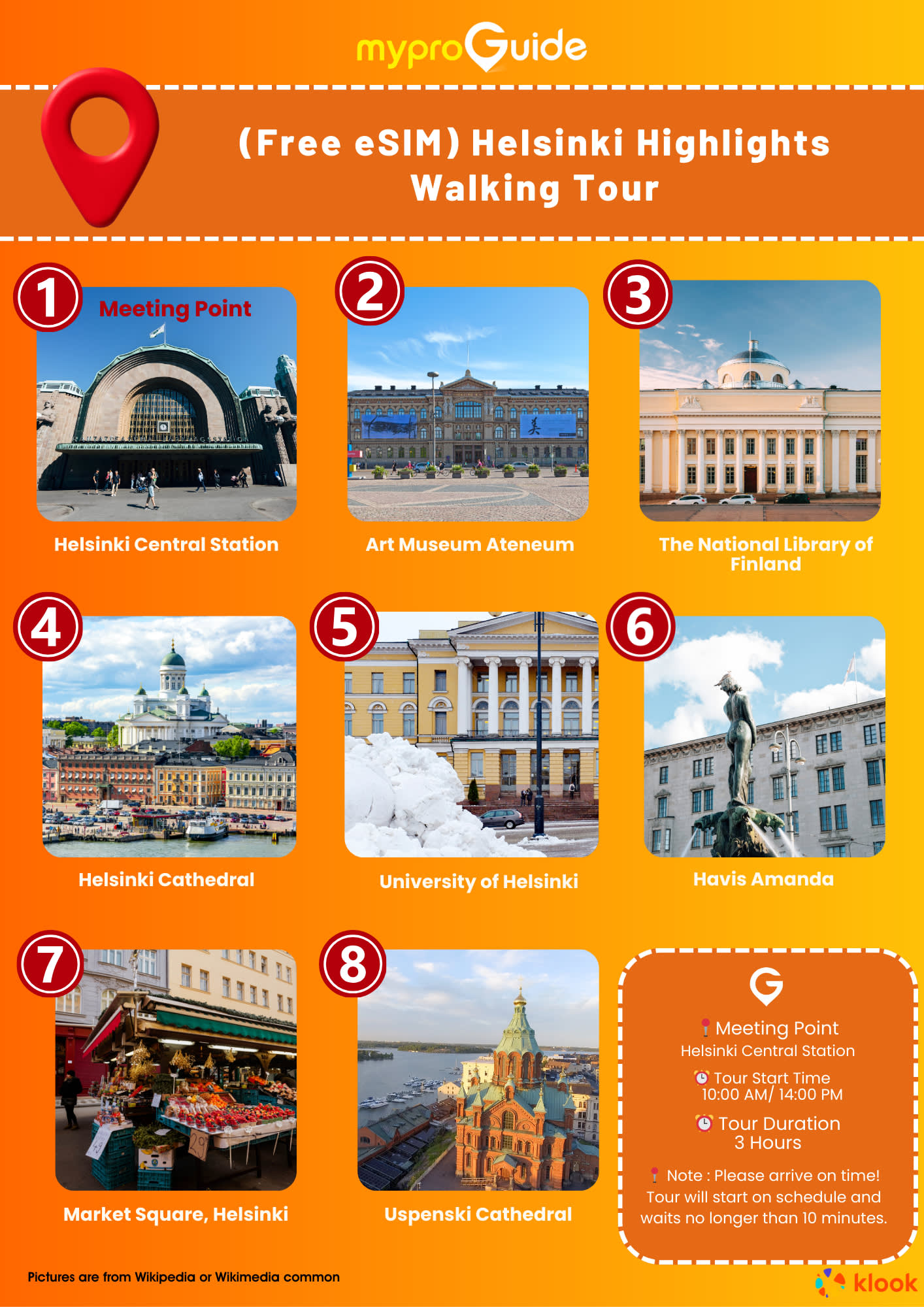 헬싱키 도보 투어에 참여해 헬싱키의 주요 명소를 탐험해보세요. 헬싱키 대성당과 국립 도서관이 있는 원로원 광장에서 투어를 시작해 마켓 광장, 우스펜스키 대성당, 하비스 아만다 동상을 방문합니다. 에스플라나디 공원을 거닐며 아테네움 미술관과 센트럴 역을 구경하고, 아름다운 오디 중앙 도서관에서 투어를 마무리합니다. 역사와 현대적인 매력이 완벽하게 조화를 이룬 투어를 놓치지 마세요!