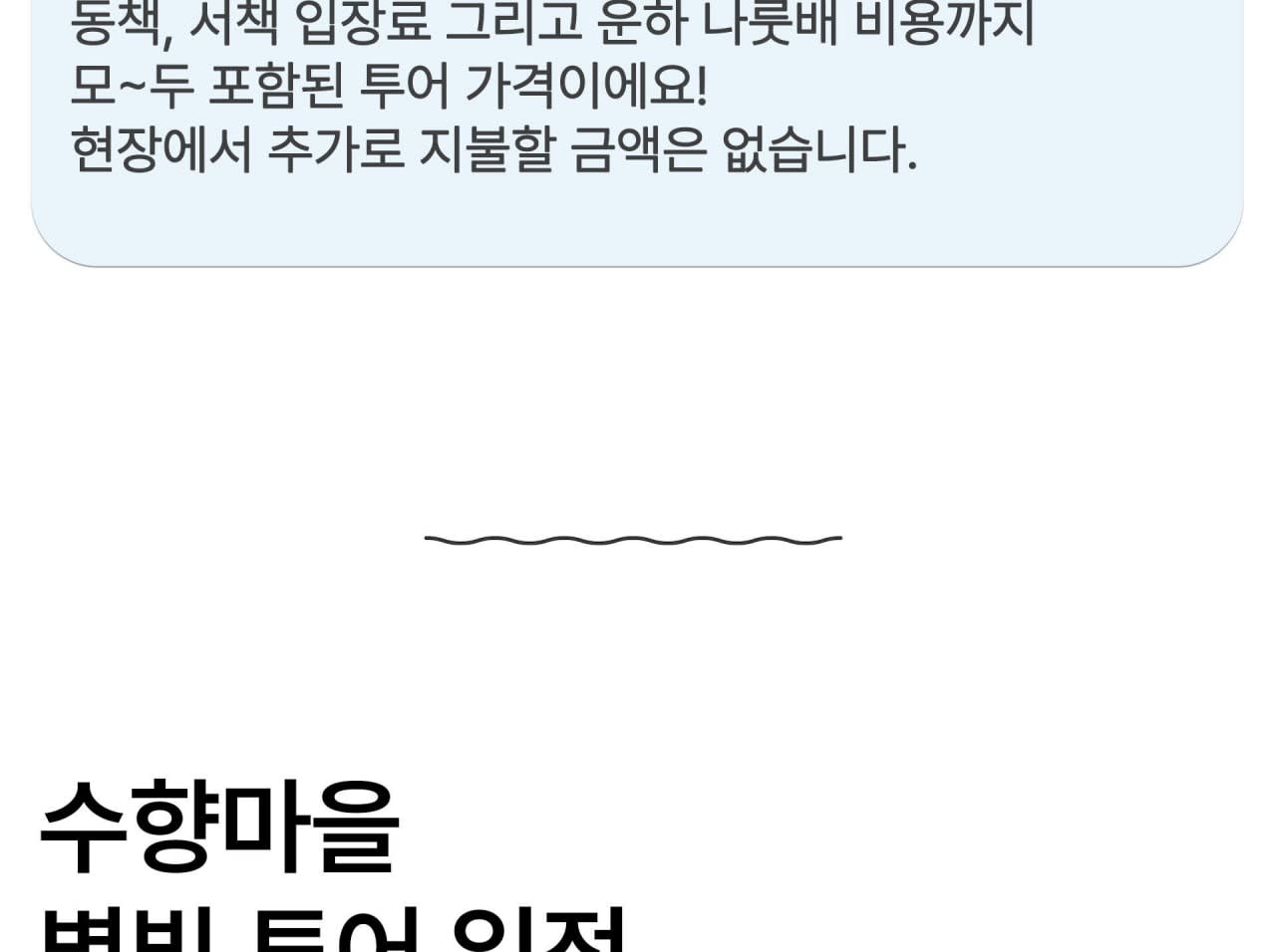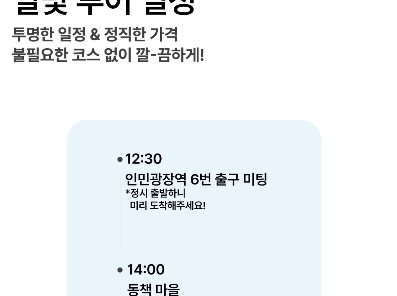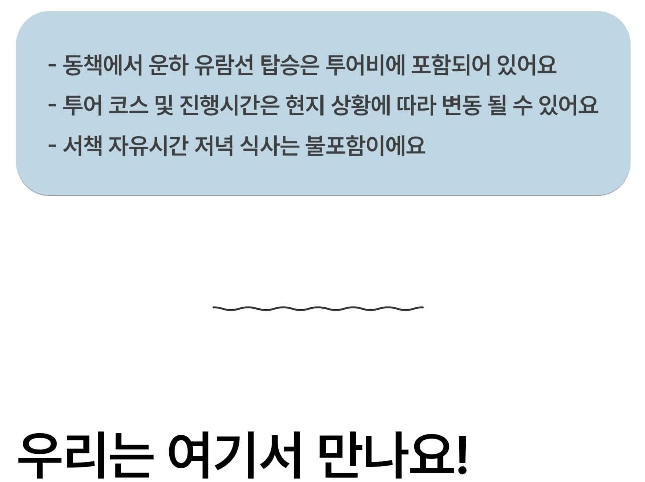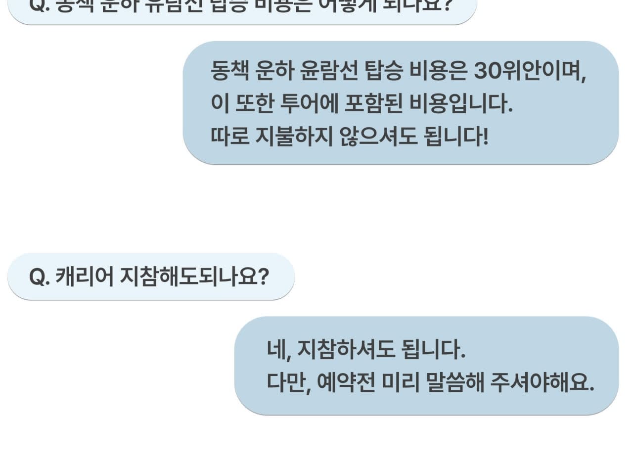 - 📌 안내사항 * 여행자 보험은 포함되지 않으므로, 필요 시 개별적으로 가입해 주시길 권장드립니다. * 여권은 반드시 지참해 주시기 바랍니다. * 최소 모객 인원 미달 또는 기상 악화 시 투어가 취소될 수 있습니다. * 예약 확정 후 카카오톡 계정 아이디를 공유해 주시기 바랍니다.