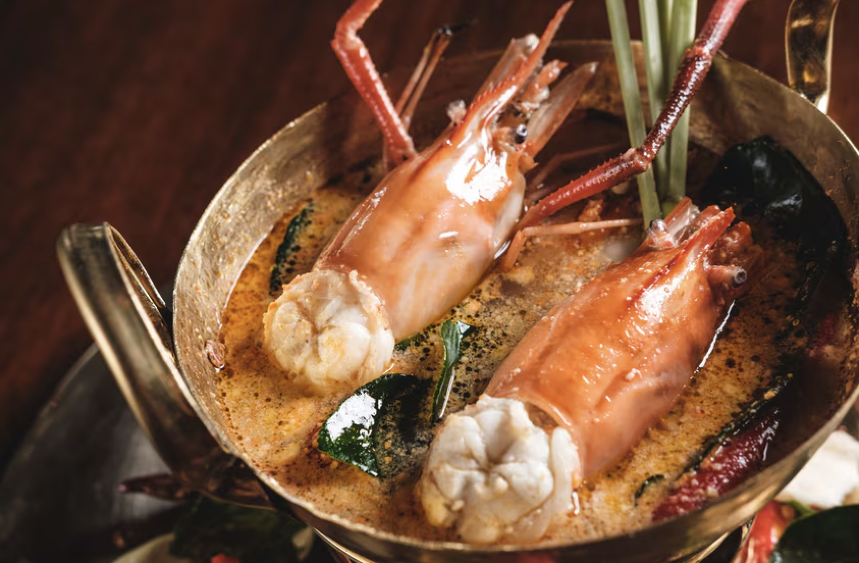 : Traditional Thai spicy-sour soup, river prawns, lemongrass, mushroom, chili and lime