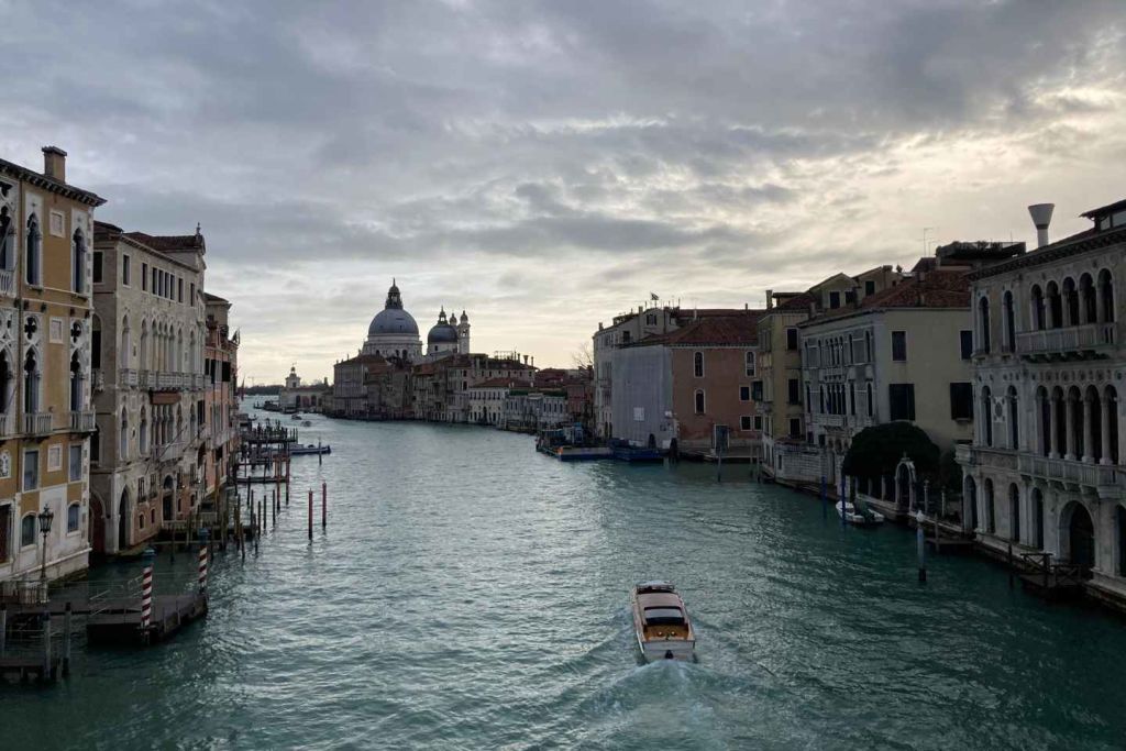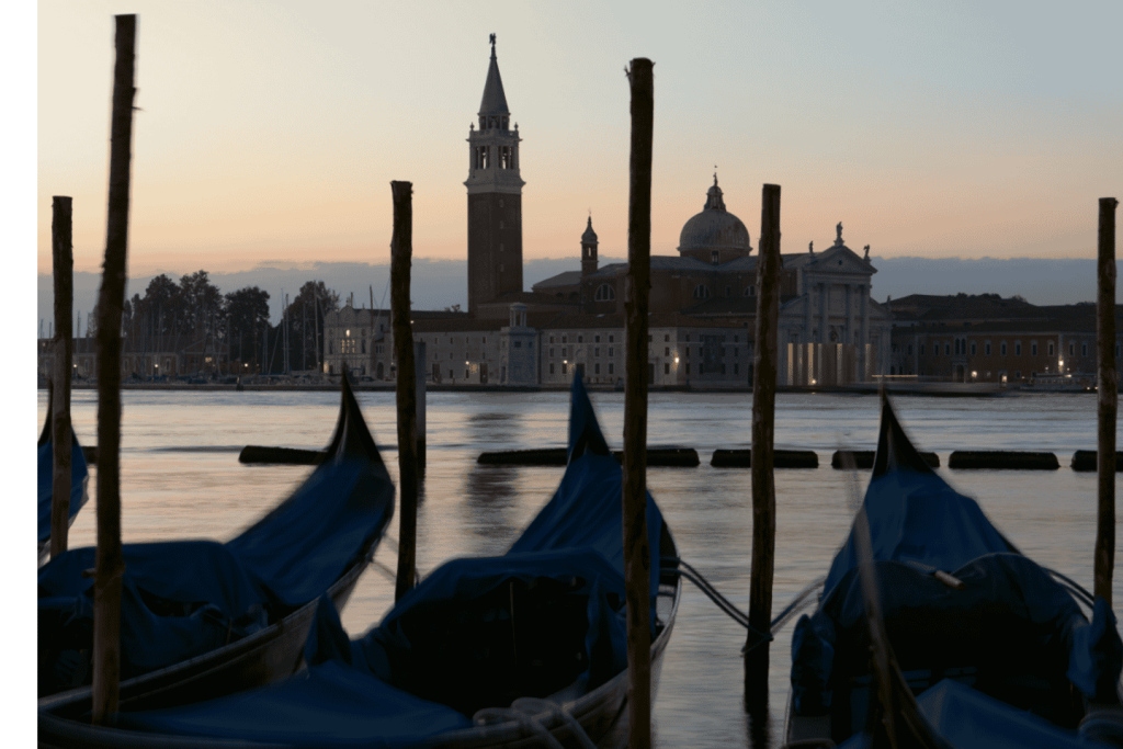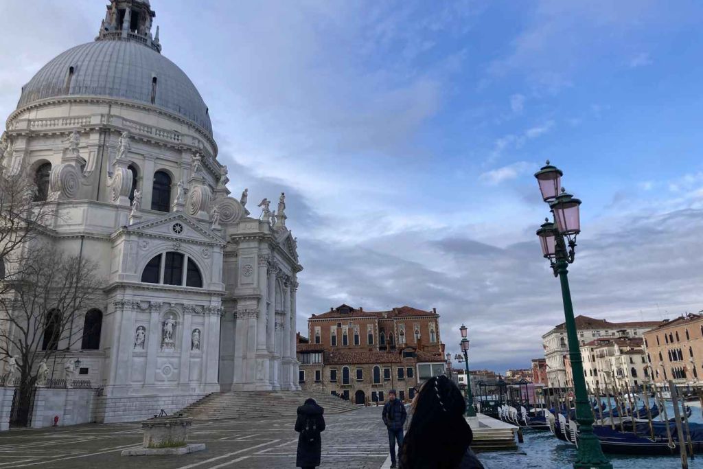 그림 같은 아카데미아 다리를 건너 대운하의 숨막히는 전경을 감상한 후 장엄한 산타 마리아 델라 살루테에 도착하세요. 부드러운 아침 햇살이 비추는 이 상징적인 성당은 베니스의 풍부한 역사와 변치 않는 아름다움을 증명하는 증거입니다.