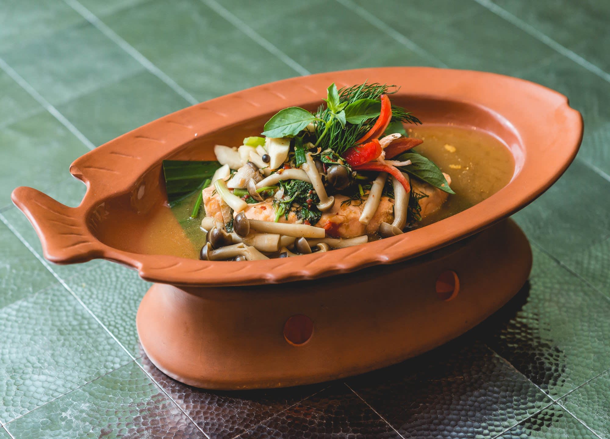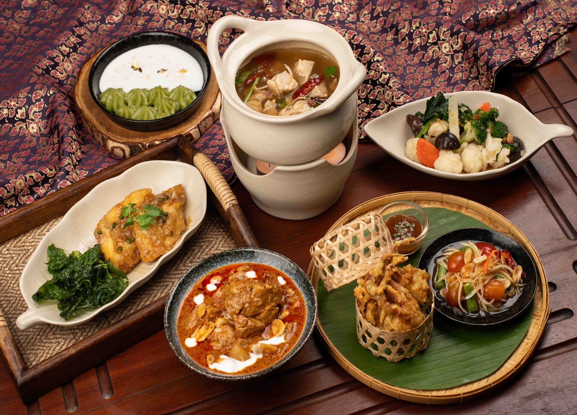 메인: 버섯, 레몬그라스, 태국 허브를 넣은 매운 돼지고기 스프, 마사만 치킨 커리, 농어 볶음 + 마늘 & 후추 소스, 야채 볶음