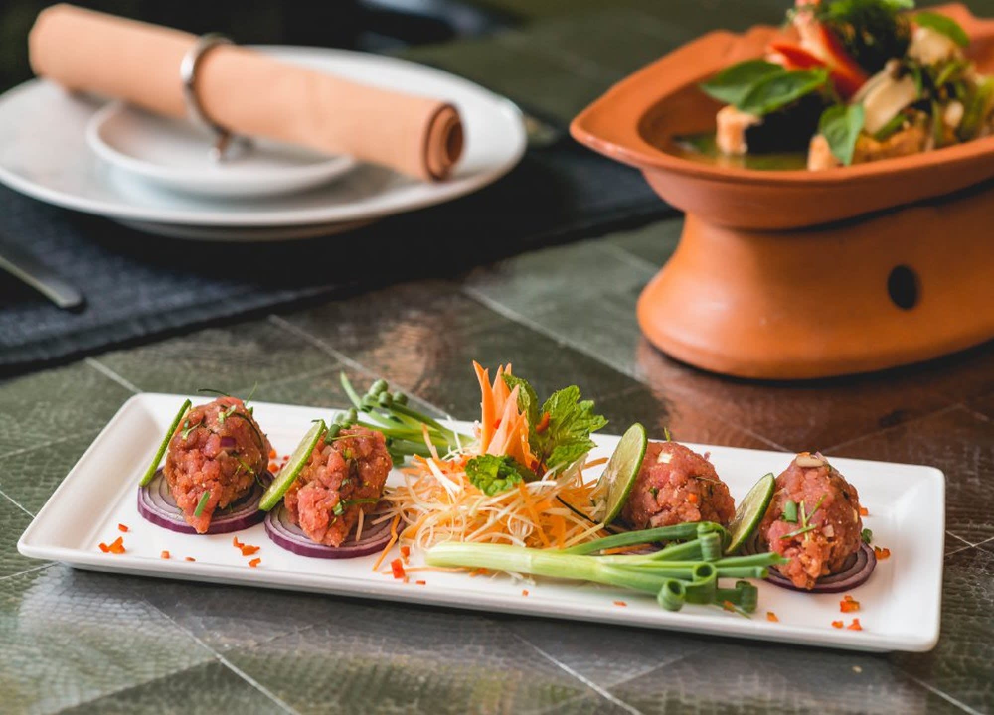 애피타이저 : 솜땀, 참깨와 타마린드 소스를 곁들인 게튀김