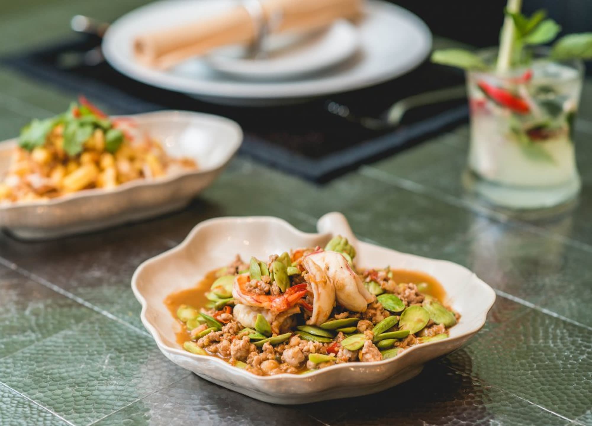레스토랑은 태국풍의 문양에 모던함이 살짝 섞이게 인테리어 되었으며 곳곳에 벤자롱 도자기를 디스플레이하여 태국의 감성을 나타내고 있습니다.
