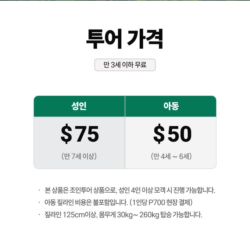 - 본 상품은 조인투어 상품으로, 성인 4인 이상 모객 시 진행 가능합니다. - 투어 시작 전 사무실에서 간단 브리핑 진행이 있습니다. - 현지 상황에 따라 시간 및 순서가 변경될 수 있습니다. - 아동 짚라인 비용은 불포함입니다. (1인당 P700 현장 결제) - 짚라인 125cm 이상, 몸무게 30~260kg 탑승 가능합니다.