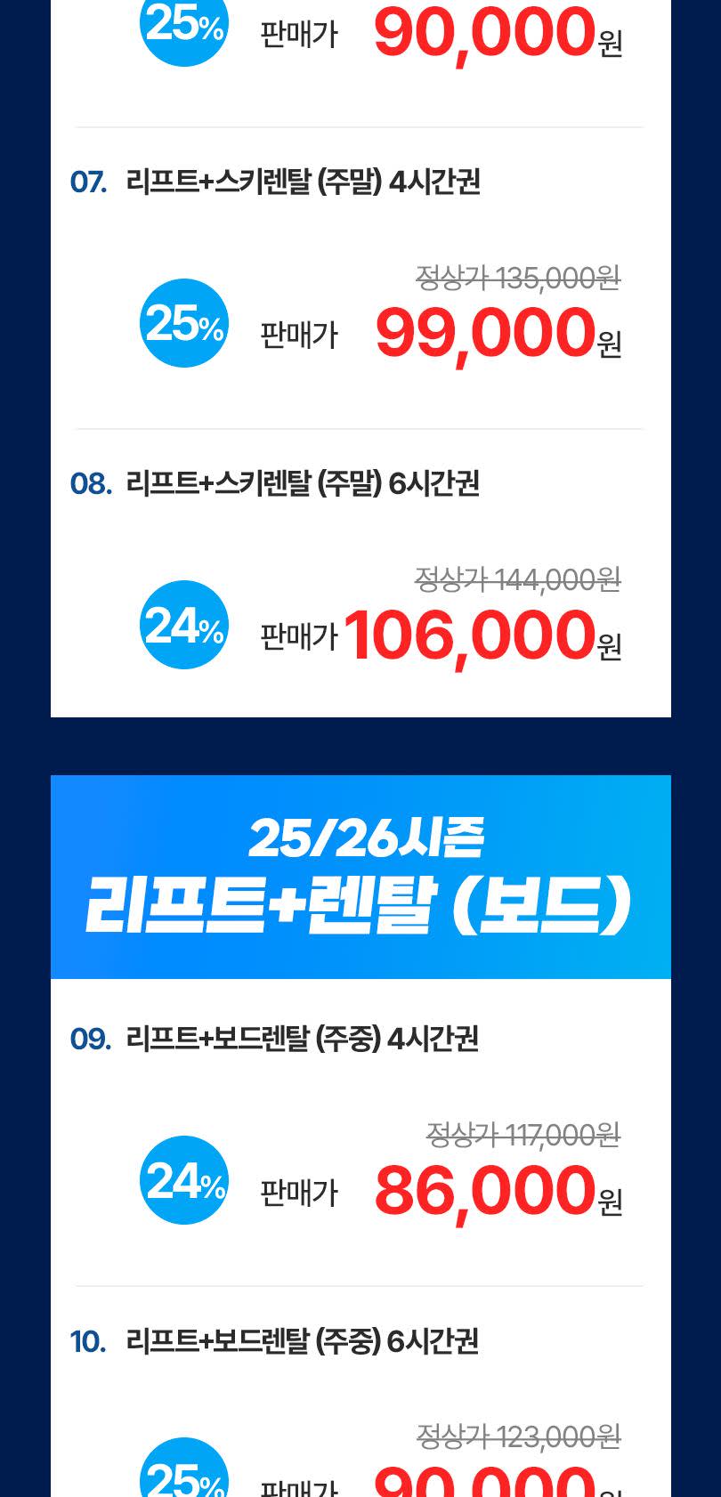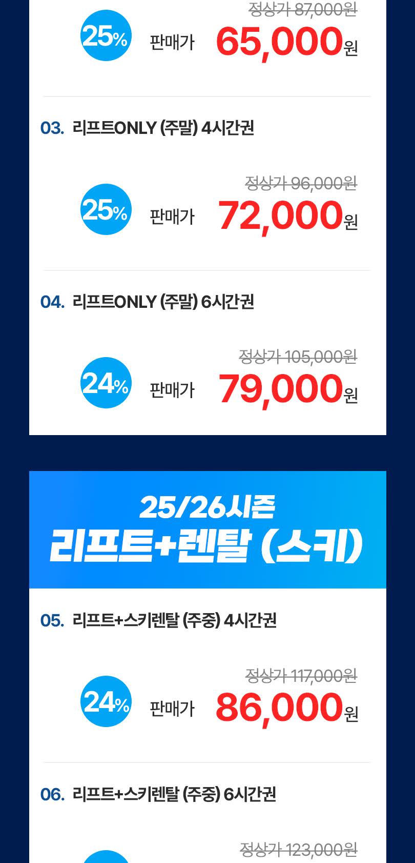 [이용 정보] * 판매기간 : ~ 2026.03.02 * 유효기간 : 2025.12.05 ~ 2026.03.02 [사용 방법] * 상품 구매 전 아래 내용을 반드시 확인해주세요 * ★ 제 3자에게 구매한 티켓은 이용 및 환불이 제한되며, 적발 시 티켓 취소될 수 있사오니 이용에 참고 부탁드립니다. (예 : 중고나라, 당근마켓 등) 이용방법 * 1. 원하는 상품 구매 * 2. LMS 문자 수신 (1시간 내 발송) - 문자 미수신 및 재발송 문의 : 1599-8370 (NOL 고객센터) * 3. 곤지암리조트App 을 통해 이용권 등록 및 예약 (이용일 일주일 전부터 등록 및 예약가능) - ※ 곤지암리조트 App 회원가입 및 설치 필수 - App 내 스키 이용권 등록 선택 - 이용권 번호 등록 후 이용일자 및 시간예약 * 4. 곤지암리조트 App → My 티켓 - 이용할 리프트권 티켓 선택 - 하단 모바일티켓 발권하기 선택 * 5. 현장 방문 후 이용 * 6. 렌탈 이용 : 스키하우스 1층 렌탈 정보 등록 QR 접속후 티켓 번호, 렌탈 이용정보 입력 후 렌탈 - 이용 1시간 전 구매 필수 - 바코드 문자 지참 필수 * 전 슬로프 오픈 이전 정설 시간 내 이용 시, 정설 시간만큼 추가 사용시간이 제공됩니다. * 전 슬로프 오픈 이후 무정지 정설 시간 내 이용 시에는 추가 사용시간이 제공되지 않습니다. * 무정지 정설 시간(17시~19시) 에는 일부 슬로프 운영이 제한될 수 있습니다. * 기상 여건, 제설 상황, 정부 방역 지침에 따라 스키장 운영 일자, 운영 시간, 정설 시간, 운영 슬로프가 변경될 수 있으니, 곤지암리조트 홈페이지 공지사항을 참고하시기 바랍니다. * 본 상품은 대/소인 공통입니다. * 리프트권을 모바일 티켓으로 이용하는 경우, 이용 시간은 발권 시점부터 적용됩니다. - (카드 티켓은 발권 후 게이트 통과 시점부터 적용) * 렌탈PKG 부분환불 불가합니다. * ▶장비 렌탈 안내 - 장비 렌탈은 현장 장비 지급 데스크에서 수령할 수 있습니다. - 스키 렌탈 : 폴, 스키, 부츠 포함 - 보드 렌탈 : 보드 데크, 부츠 * ※ 장비 렌탈에는 의류와 헬멧, 고글은 미포함되어 있습니다. * ※ 본 상품은 대/소인 공통 티켓입니다. * ※ 주중/주말 구분 - 주중 : 월~금, 공휴일 전일(전날) 이용가능 - 주말: 토, 일 ,공휴일 당일 이용 가능 * ※ 주중권으로 주말 이용불가 , 주말권으로 주중 이용 불가 * ※ 주중 상품은 주말(토,일,공휴일) 사용이 불가하며, 주말 상품은 주중 사용이 불가능합니다. * ※ 슬로프 운영시간은 곤지암 리조트 홈페이지 참고 부탁드립니다.