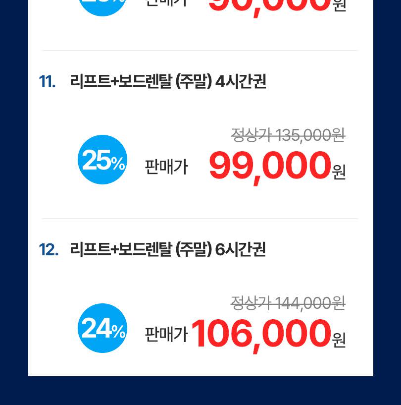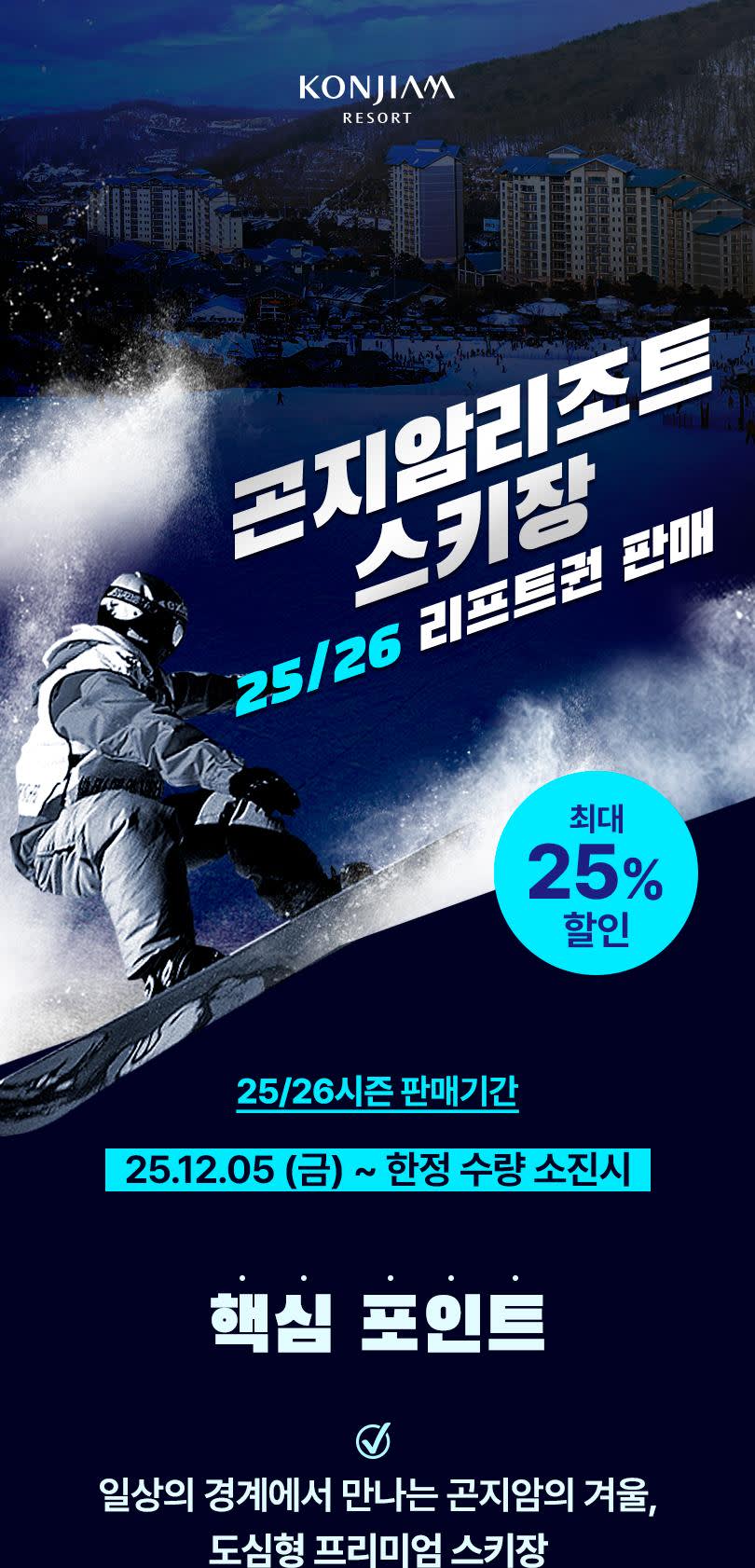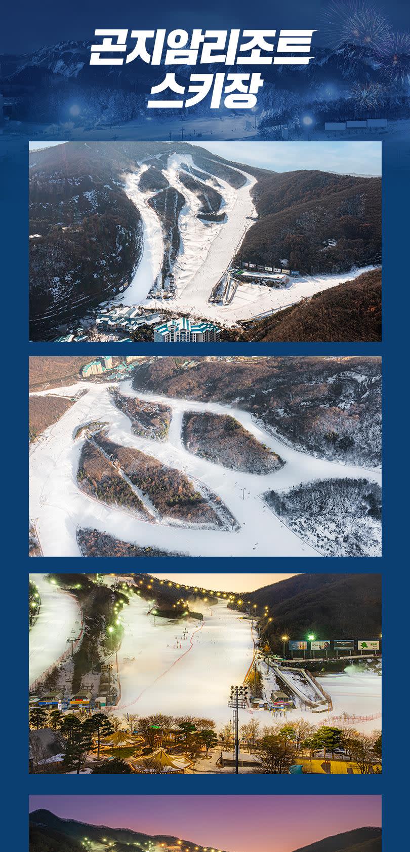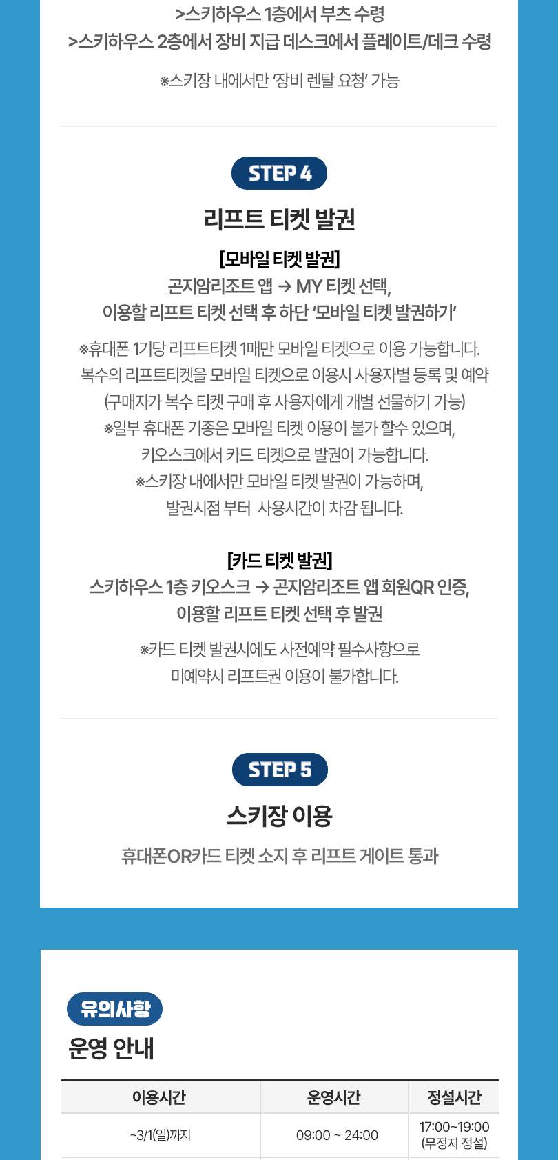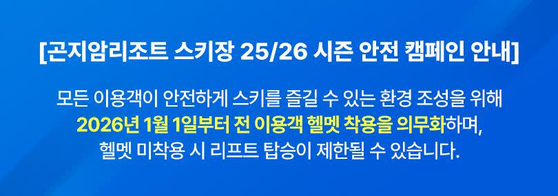 - 당일이용 가능여부 : 당일 이용 가능 곤지암리조트App 을 통해 이용권 등록 및 예약 (이용일 일주일 전부터 등록 및 예약가능)