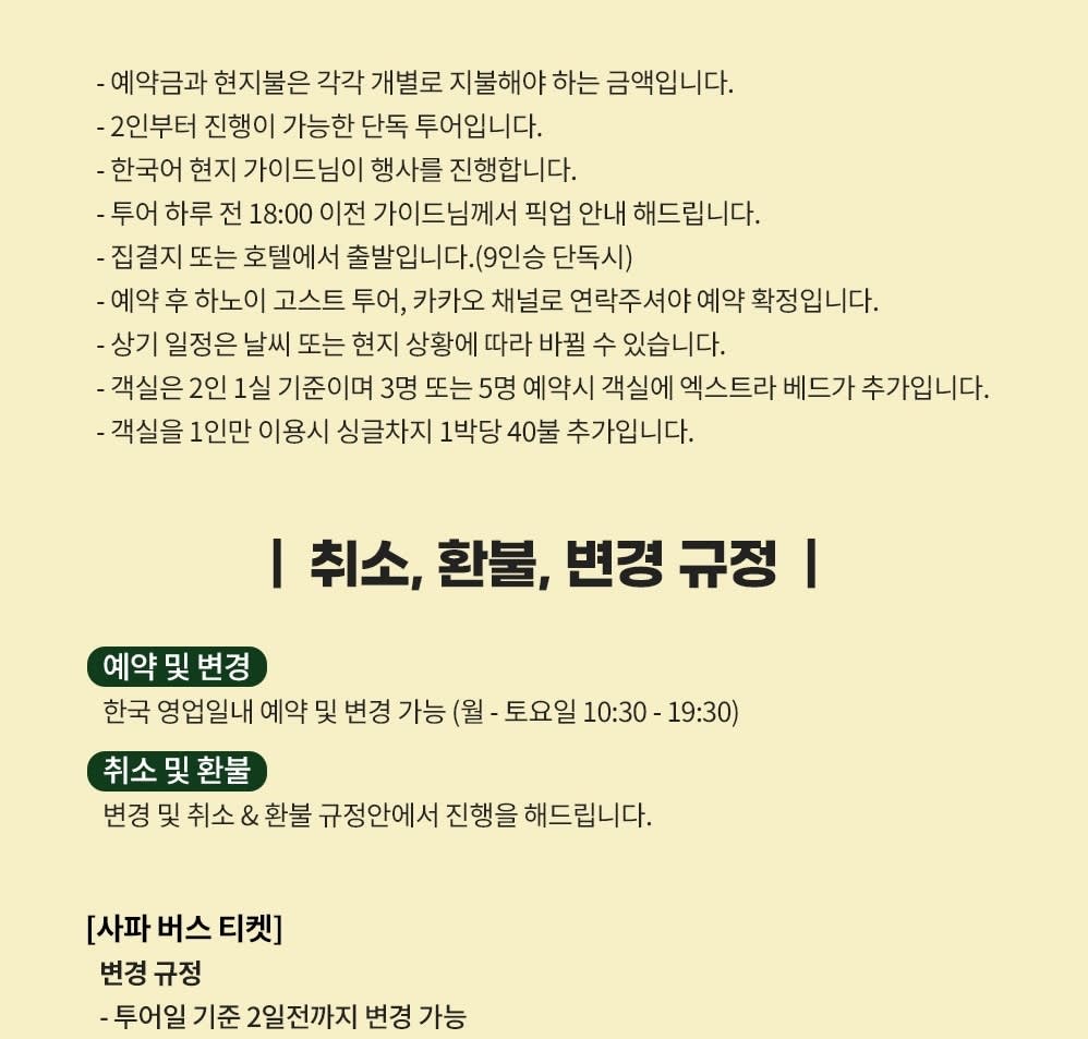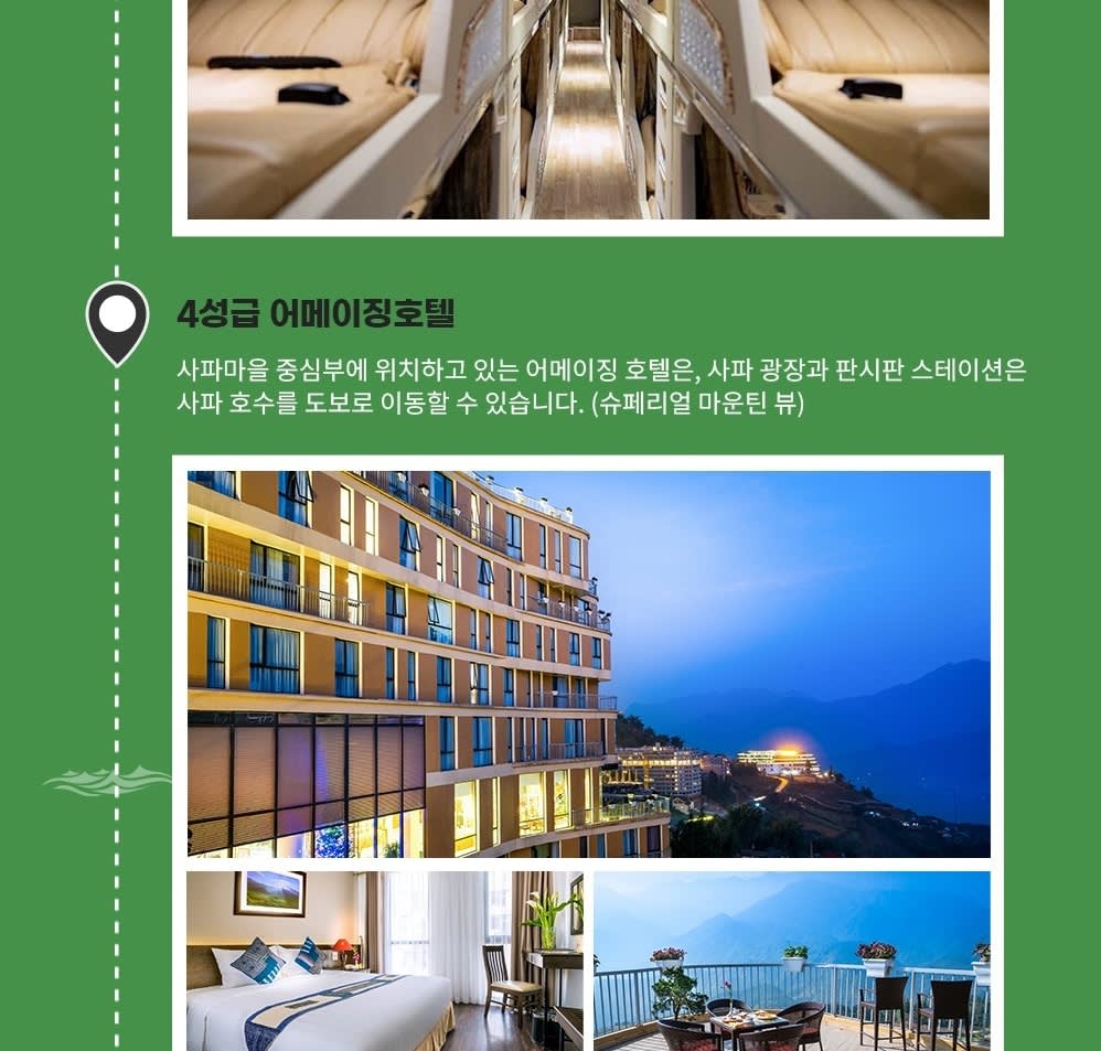 호텔, 식사, 차량, 입장권까지 거의 대부분 포함되어 있어서 복잡한 준비 없이 그냥 출발만 하면 되는 편안한 여행이에요. 슬리핑 버스로 이동하니 몸도 훨씬 덜 피곤해요! 깟깟마을·판시판 등 사파에 오면 꼭 가야 하는 코스들이 일정에 깔끔하게 담겨 있고, 중간중간 맛집 식사와 자유시간까지 있어 여행 균형이 딱 좋아요.