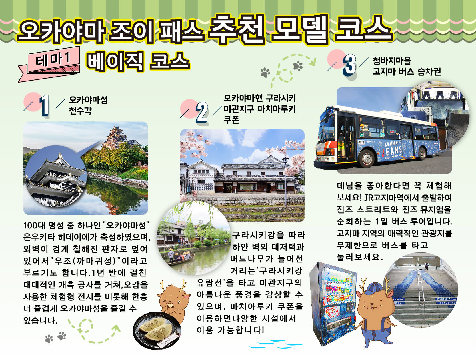 * 오카야마에서 세 곳을 골라 즐길 수 있는 패스! 유메지 향토 미술관, 구라시키 미관지구 거리 산책 쿠폰과 일명 '청바지의 도시'인 고지마 일일 버스 패스 등이 포함되어 있어요.
