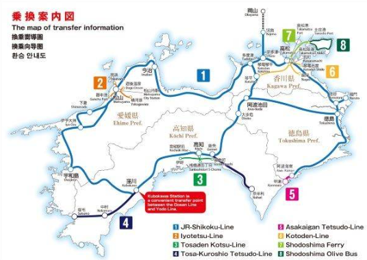 (2)아사카이간철도 전 노선, 이요철도 전 노선, 다카마쓰코토히라 전기철도 전 노선, 도사덴교통의 노면전차 전 노선.