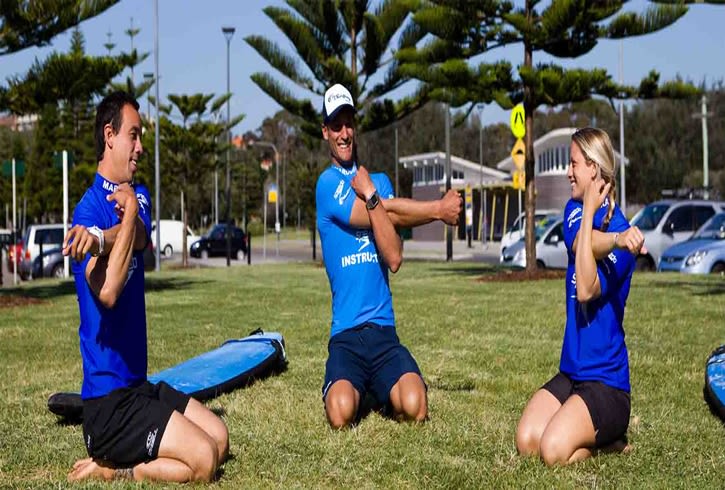 본다이 비치에 자리를 잡고 먼저 안전교육 및 준비운동이 시작됩니다.