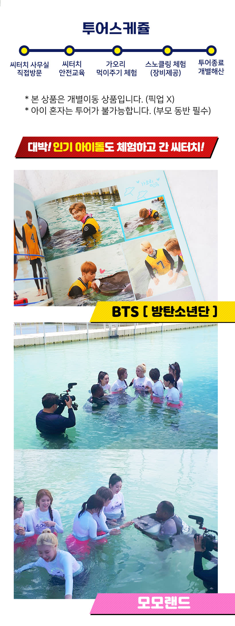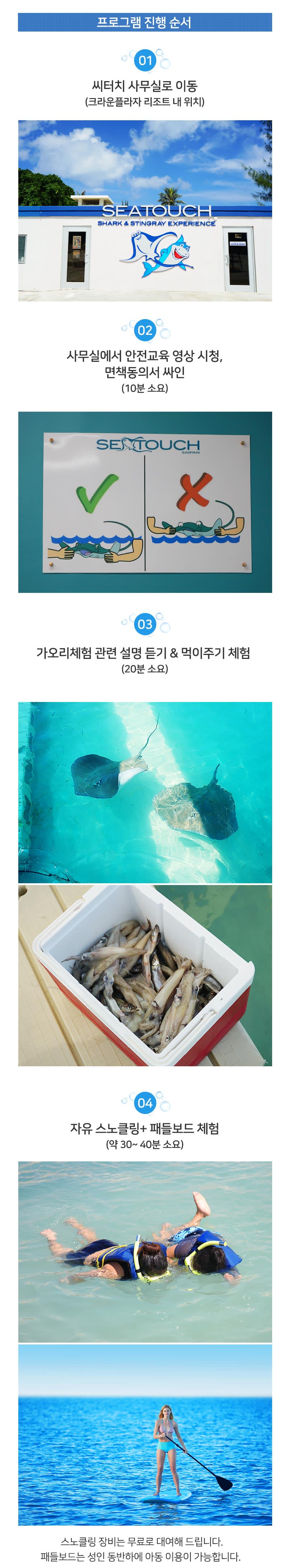 1. 운영시간 10:30 / 11:00 / 13:00 / 14:30 / 15:30 2. 이용시간 약 1시간 3. 가는 방법 개별이동 (크라운 플라자 내 씨터치 사무실) 4. 이용기준 아이 혼자 투어는 불가능 합니다. (부모님 한분 이상 투어 참여하셔야 합니다) 5. 준비물 및 복장 수영복, 수건, 선글라스