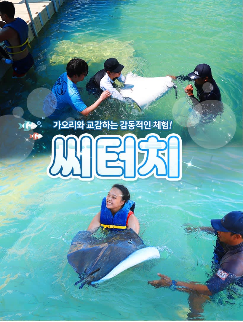 씨터치는 실외 아쿠아리움에서 다양한 물고기와 가오리 등 여러 해양 동물들도 보고 같이 수영도 할 수 있어요! 여러마리의 가오리를 직접 만져보고 먹이주기 체험도 가능한 특별한 투어에요!