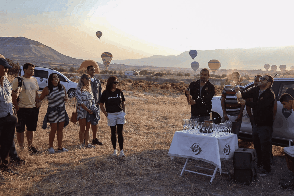 카파도키아의 경치 위를 날아오르면서 풍선이 서서히 고도를 높여가는 모습을 지켜보세요. 지상으로 돌아오면 스파클링 와인이나 샴페인으로 비행을 축하하세요. 호텔로 돌아가기 전에 비행을 기념할 수 있는 비행 인증서를 받으세요.
