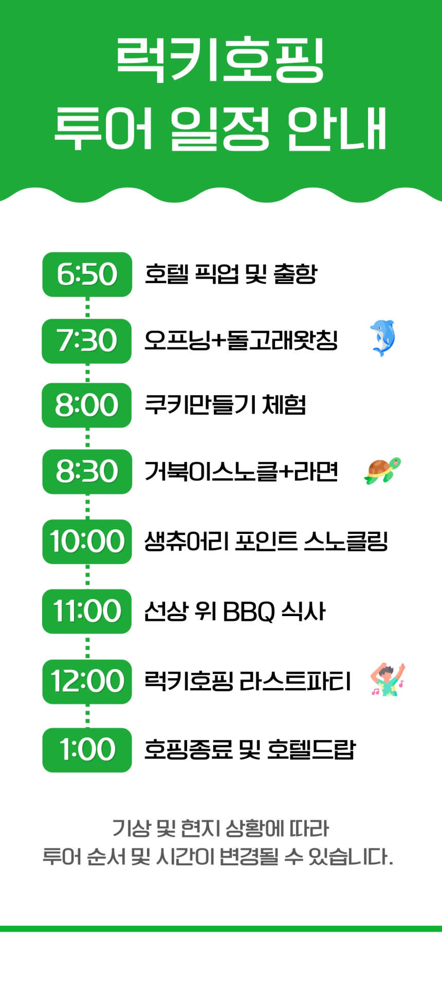 돌고래 탐험, 거북이 스노클링, 쿠키 만들기, BBQ와 음악 퍼포먼스까지