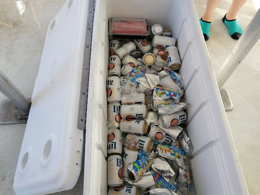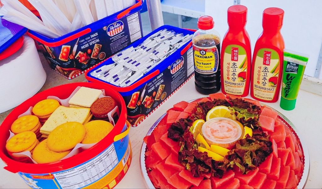 7. 스노클링과 낚시가 끝나면 참치와 음료를 즐길 수 있습니다.