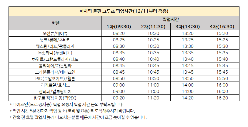 * 위 시간은 출항 시간이며, 픽업 시간이 아닙니다.