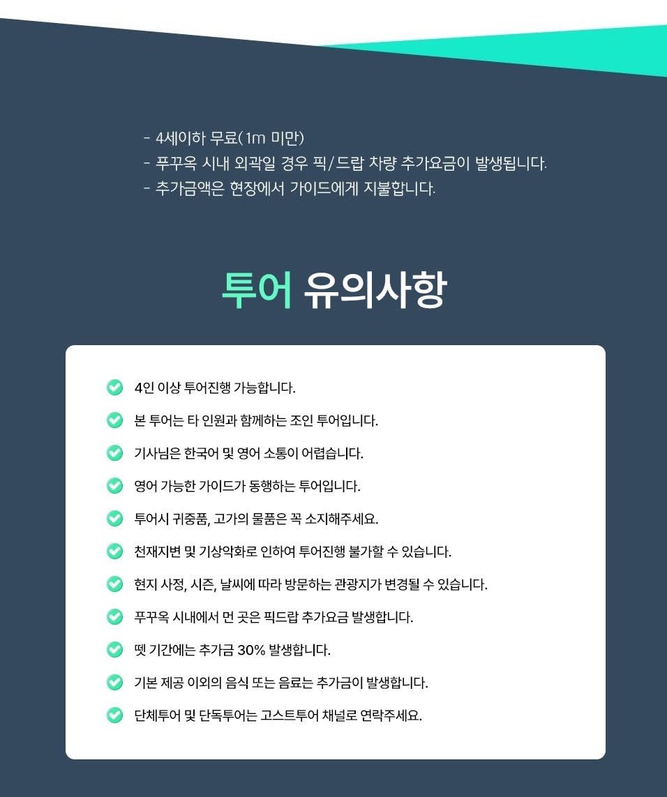* 카카오채널로 연락주셔야 예약확정 가능하니 반드시 예약시에는 해당 카카오 채널로 연락바랍니다. (카톡검색시 @푸꾸옥고스트투어) * 베트남 국/공휴일에는 인건비, 차량비 등이 인상되는 관계로 추가금(현지지불 등)이 발생될 수 있습니다.