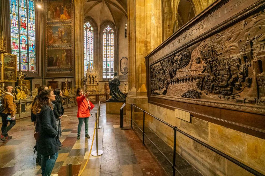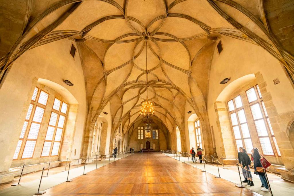성 바츨라프와 찰스 4세의 무덤, 네포묵의 성 요한 바로크 양식의 무덤, 성 바츨라프 예배당을 둘러보세요. 다음으로 구 왕궁으로 들어가세요. 블라디슬라프 홀의 거대한 아치형 천장 아래에 서 보세요.