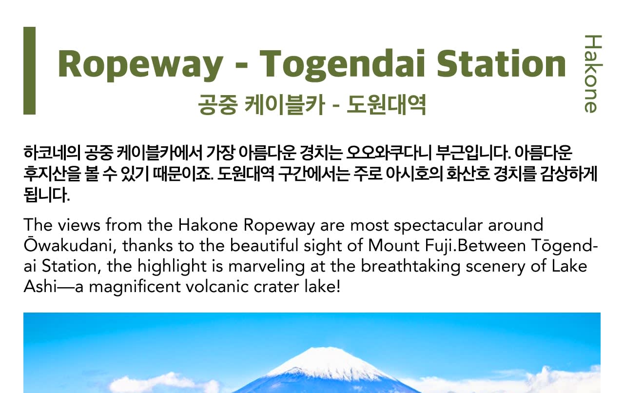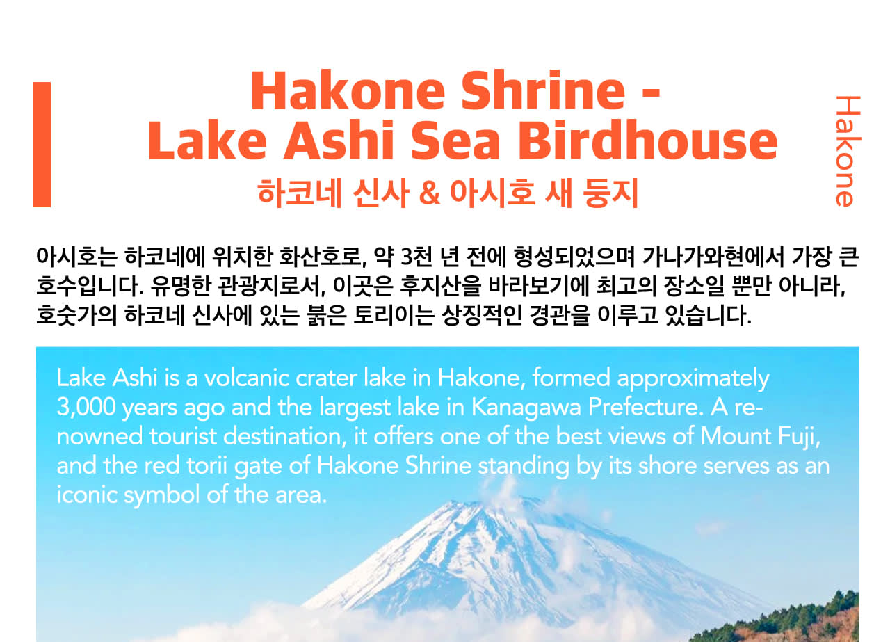 ▶한국어 가능 투어 가이드 - 이용요건 * 본 상품은 이용 가능 연령이 제한되어 있지 않습니다. * 만 0-3세는 별도의 좌석이 필요하지 않은 경우 무료입니다. * 만 3세 이상은 성인과 동일한 요금이 적용됩니다. - 추가정보 * 공지사항: 1월 31일부터 2월 20일까지 하코네 로프웨이의 오와쿠다니역 토겐다이역 구간이 일시적으로 운행 중단됩니다. 이 기간 동안 운행 구간은 소운잔역 오와쿠다니역으로 조정됩니다. * 미팅 장소에는 출발 최소 15분 전까지 도착해주세요. 늦게 도착하시는 경우 환불은 불가합니다. * 악천후 또는 유지 보수로 인해 로프웨이가 폐쇄될 경우, 1인당 JPY1,000 티켓 환불에 대해서는 이메일로 문의해 주시기 바랍니다. * 투어 전날 저녁, 가이드 및 운전기사 미팅 장소 정보가 포함된 이메일을 보내드립니다. 받은 편지함과 스팸/정크 폴더를 확인해 주시기 바랍니다. * 후지산의 가시성은 날씨에 따라 달라지며 보장되지 않습니다. 미리 일기 예보를 확인하세요. * 일부 관광지에서는 카드 결제가 불가능할 수 있으니 현금을 챙겨가세요. * 주말, 공휴일 또는 성수기에는 교통 상황이나 악천후로 인해 투어에 영향을 미칠 수 있습니다. 현지 상황에 따라 가이드가 관광지 순서, 투어 시간, 또는 방문지를 취소할 수 있습니다. 복귀 시간이 유동적이므로 투어 후 다른 일정을 잡지 않는 것이 좋습니다. * 본 투어는 여러 나라에서 온 여행객들과 함께하는 그룹 투어입니다. 가이드가 여러 언어로 설명을 제공해 드립니다. - 준비물 * 현금 - 차량 & 수하물 정보 * 수하물 수용: 표준 크기 수하물 1개