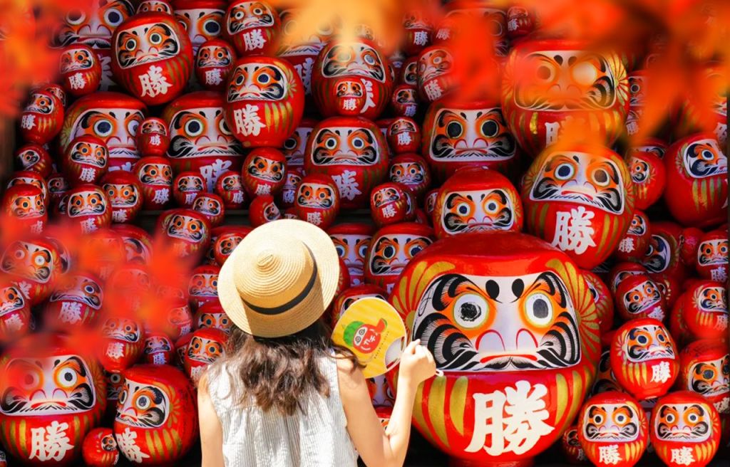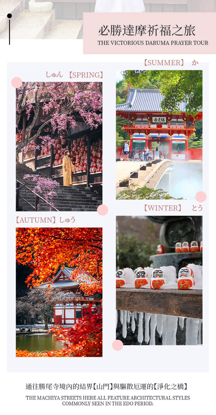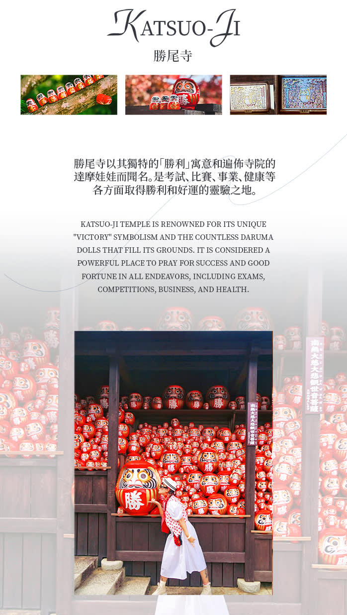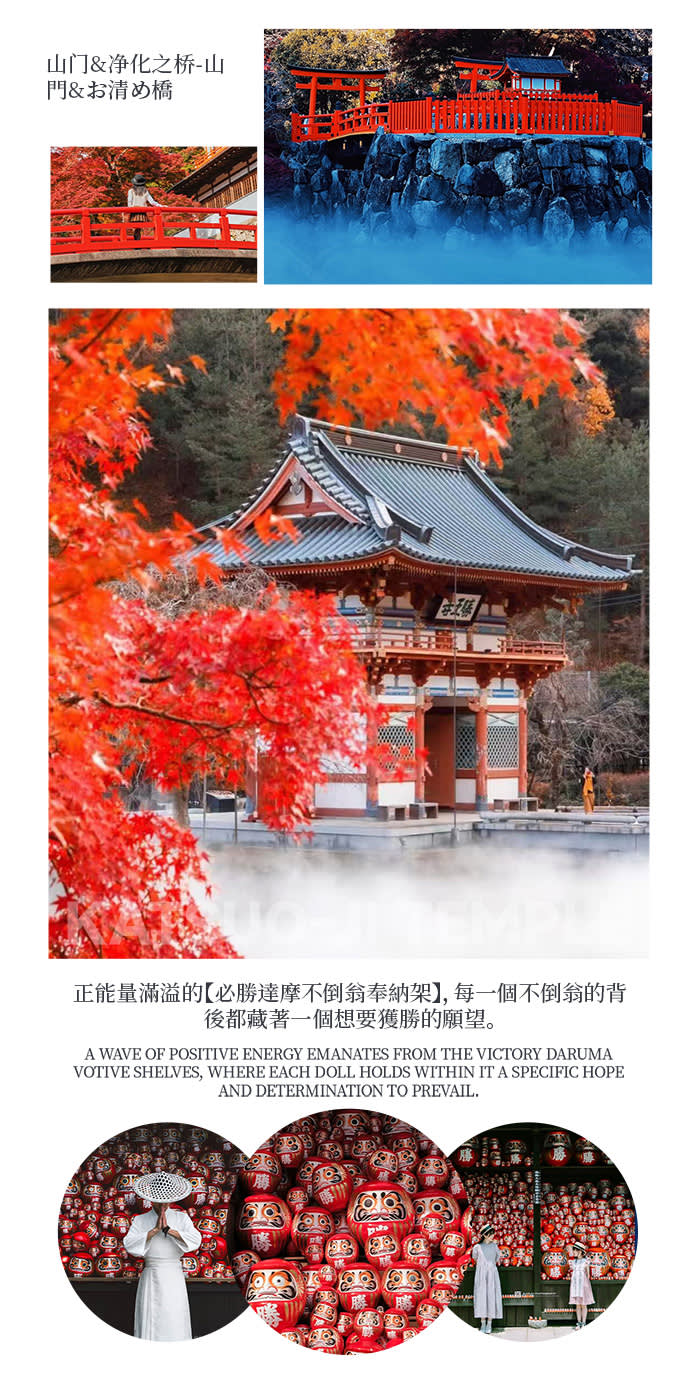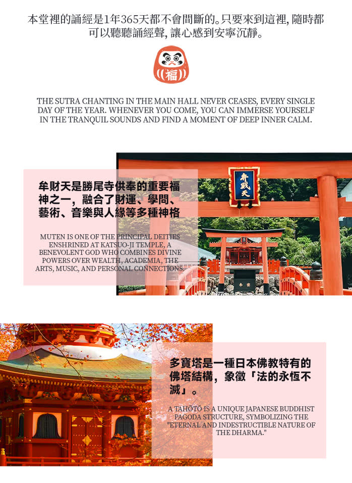 • 【첫 번째 코스】 가쓰오지(勝尾寺)에서 기도: 미노오(箕面) 산간에 위치한 가쓰오지는 '필승 기원'으로 유명하며, 붉은 달마와 가을 단풍이 어우러져 있습니다. 행운과 행복을 기원하며 장엄하면서도 몽환적인 분위기를 느껴보세요.