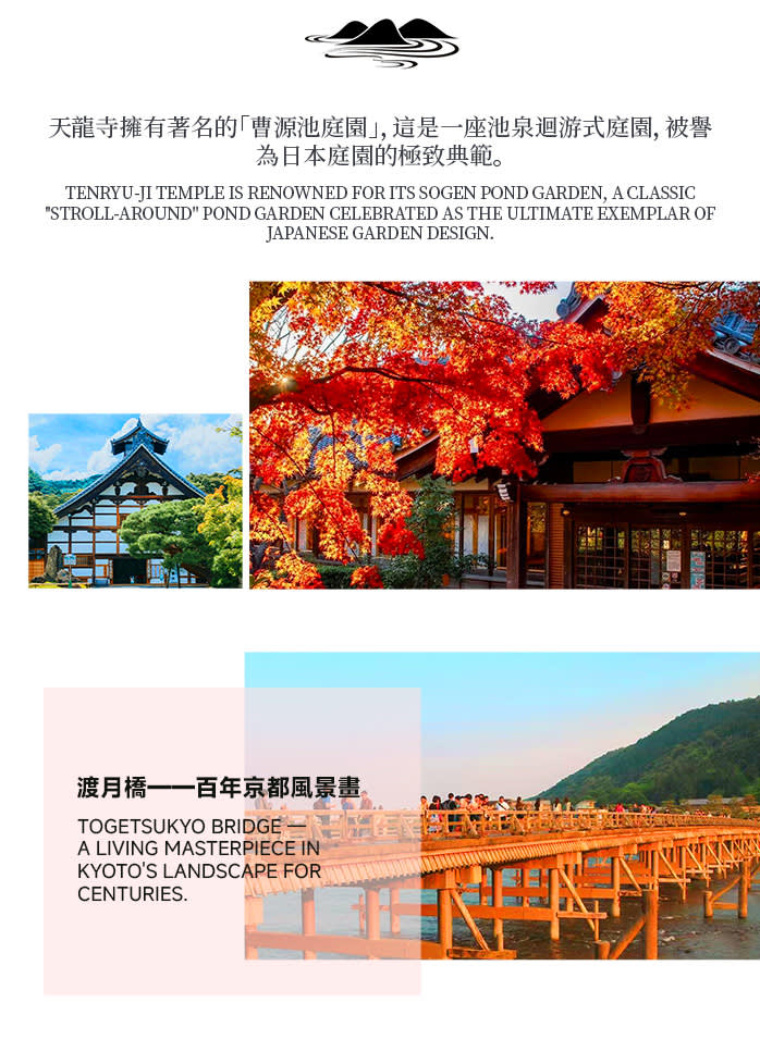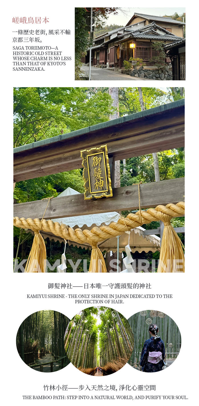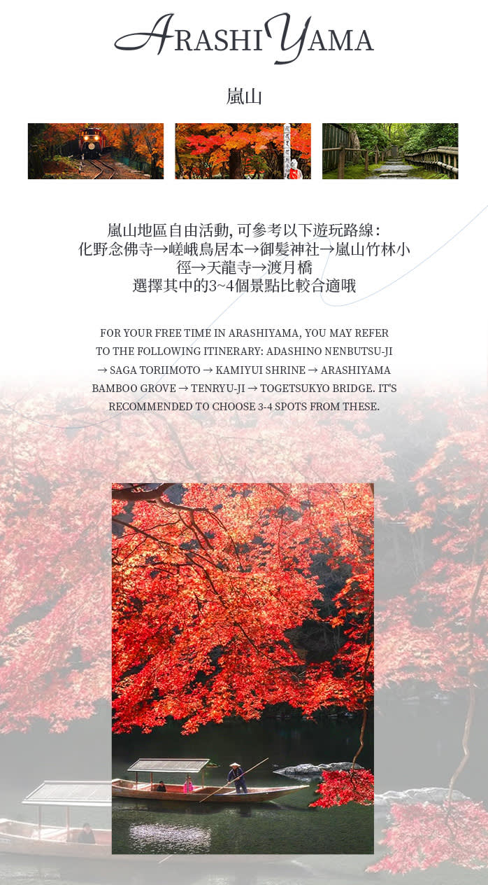 • # 이 노선을 통해 하루 만에 교토의 자연미, 고찰 문화와 동화 같은 환상적인 분위기를 경험할 수 있으며, 가을 교토에서 놓칠 수 없는 몰입형 비경 여행입니다.