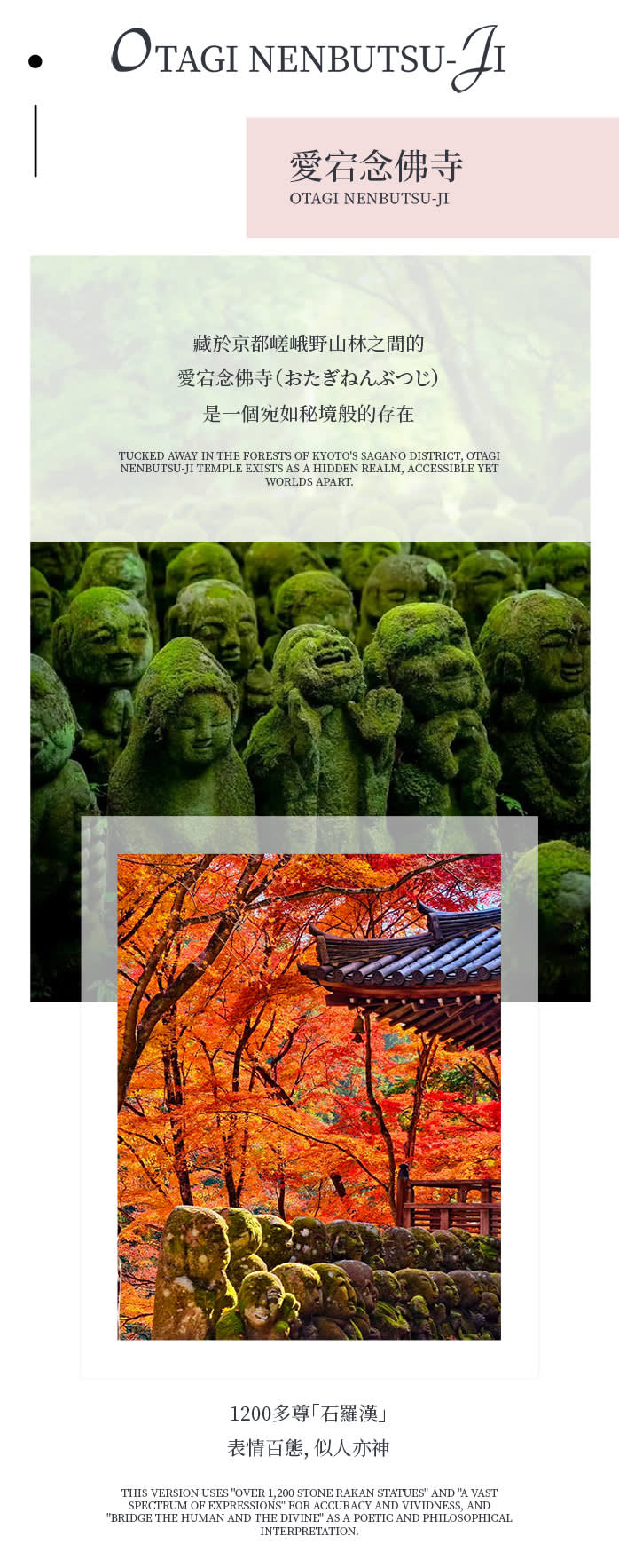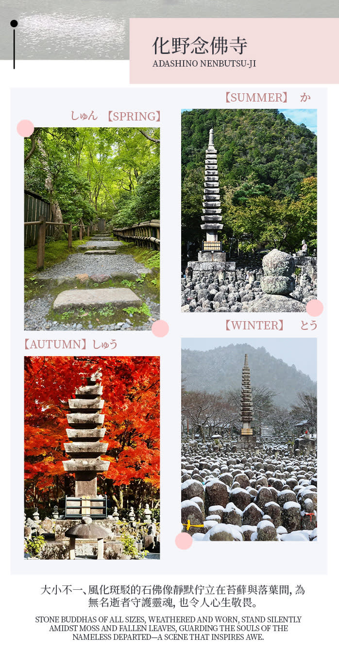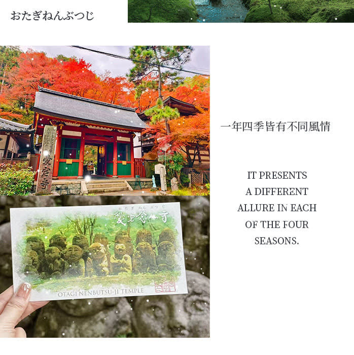 • 【두 번째 코스】 아타고 넨부쓰지(愛宕念佛寺) 도보 단풍 구경: 산간 돌계단과 구불구불한 오솔길을 따라 도보로 이동하며, 수백 개의 석불이 조용히 줄지어 있고 단풍이 둘러싸여 있어 마치 '센과 치히로의 행방불명'과 같은 환상적인 비경으로 들어가는 듯합니다. 도보로 이동하면서 선의(禪意)를 느끼고 마음껏 사진을 찍을 수 있습니다. 중요 팁: 수요일, 토요일은 아타고 넨부쓰지 정기 휴일이므로 【조자코지(常寂光寺)】로 변경됩니다. 조자코지에는 주차 공간이 없으므로 주차장에서 도보로 약 20분 정도 걸어가야 합니다.