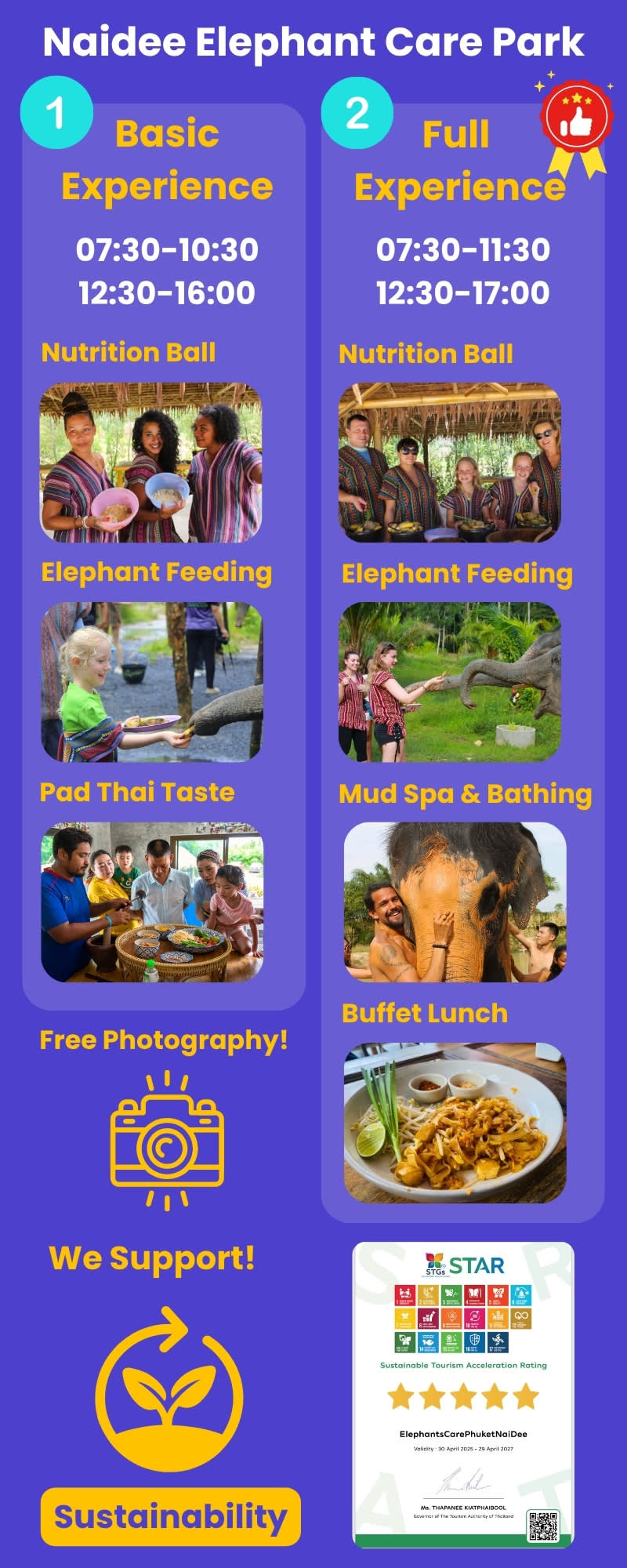 • 두 가지 흥미로운 프로그램 중에서 선택하세요: Basic Elephant care – 가이드 투어, 코끼리 식사 준비 및 먹이 주기, 재미있는 사진 촬영, 정통 태국 요리 2가지 맛보기. Full Elephant care – 상기 모든 내용 포함, 머드 스파, 코끼리 목욕 및 수영, 맛있는 뷔페
