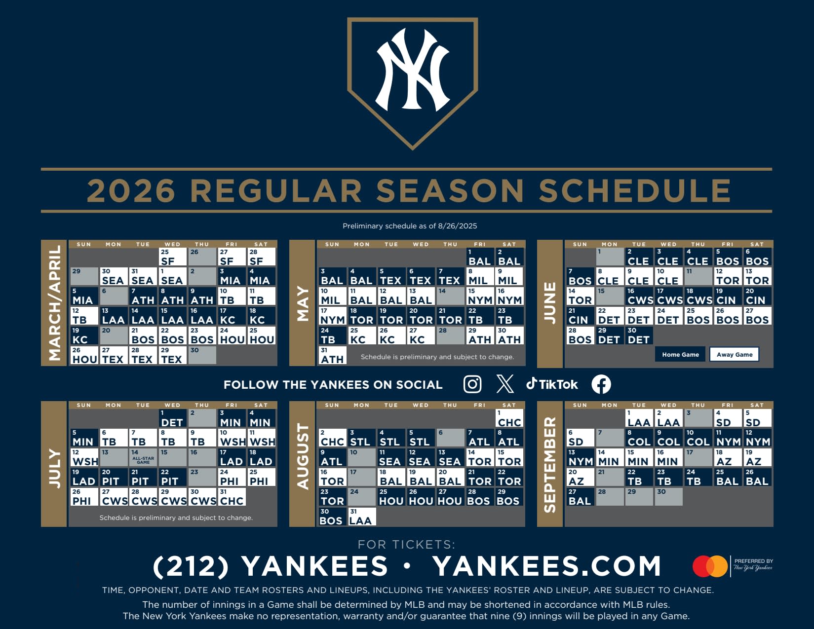 27회 월드 챔피언의 홈구장인 양키 스타디움을 방문하는 것만큼 "뉴욕, 뉴욕"을 잘 표현하는 것은 없습니다. 양키 스타디움에 처음 들어서는 순간을 기억하게 될 것이며, 끝내기 안타를 처음 보는 순간은 결코 잊지 못할 것입니다. 기념 공원에서 우리의 유구한 역사를 둘러보거나 뉴욕에서 가장 큰 무대에서 야구 경기를 관람하고 싶으시다면, 양키 스타디움 방문은 잊을 수 없는 경험이 될 것입니다. 경기장은 미드타운 맨해튼에서 지하철이나 택시로 25분 거리에 있습니다. 액션, 열정, 흥분을 즐기러 오세요. 지금 바로 티켓을 구매하세요!