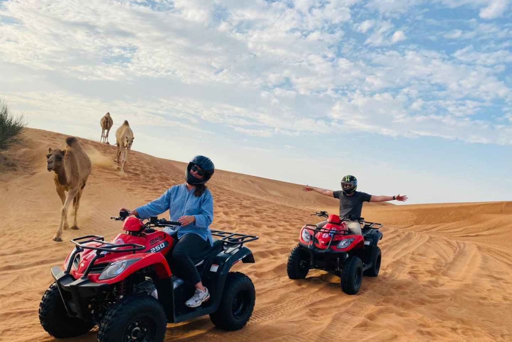 호텔 또는 지정 장소에서 픽업 서비스를 이용합니다. 사막에 도착하면 에어컨이 설치된 텐트에서 다과(아랍식 차/커피와 대추야자)를 즐기며 휴식 시간을 가집니다. 쿼드 바이킹을 준비하며 안전 브리핑을 듣습니다. 이후 아름다운 붉은 모래 언덕 사막을 가로지르는 쿼드 바이크 라이딩을 시작합니다. 샌드보딩, 낙타 타기 등 다른 사막 활동도 체험해 보세요.