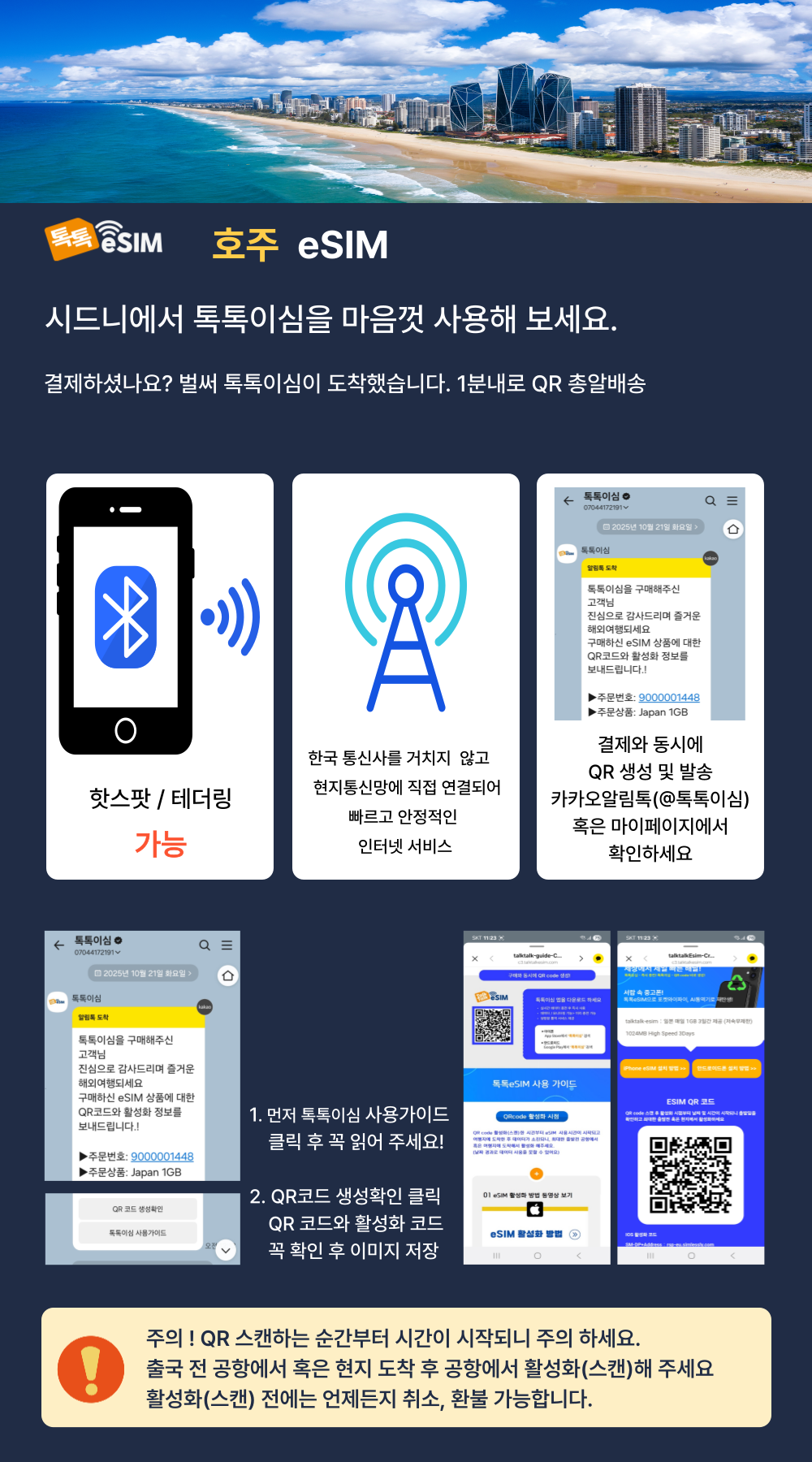구매한 eSIM을 QR코드 스캔(활성화)하면 취소/환불이 불가합니다. QR코드 스캔(활성화)한 시점부터 시간이 시작되니 공항에서 출발전 스캔(활성화 )하길 권장합니다. 톡톡이심 앱을 이용하면 실시간 데이터 사용량을 확인할 수 있습니다. 데이터 부족시 앱에서 바로 구매할 수 있습니다. 톡톡이심 앱에서 실시간 쌍방향 통역서비스를 무료로 이용할 수 있습니다.